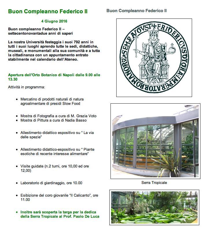 Vi aspettiamo tutti Sabato 4 Giugno dalle 9:00 per trascorrere una mattinata piacevole e rilassante presso uno dei più antichi e belli orti botanici d'Europa, normalmente chiuso al pubblico. Slow Food Napoli è ospite in occasione dei festeggiamenti del compleanno della Federico II. Sono previste interessanti attività gratuite, fra cui visite guidate tra le meraviglie dell'Orto, concerto, mostre etc