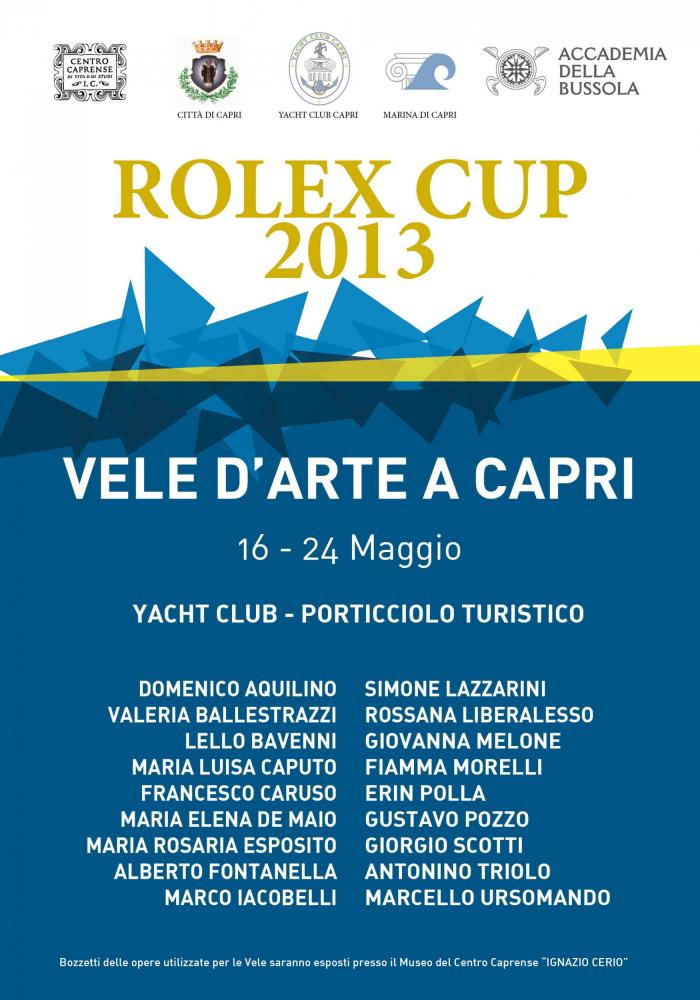 L’Accademia della Bussola, dopo il grandissimo successo delle edizioni 2012 e 2013 di Vele d’Arte per l’America’s Cup, in occasione della ROLEX CUP 2013 ha stipulato un accordo con lo Yachting Club e il Porticciolo Turistico di Capri per una Mostra da tenersi nel comprensorio del Porticciolo Turistico e dello stesso Club sul tema del Viaggio, delle Vele e del Mare dal titolo:
