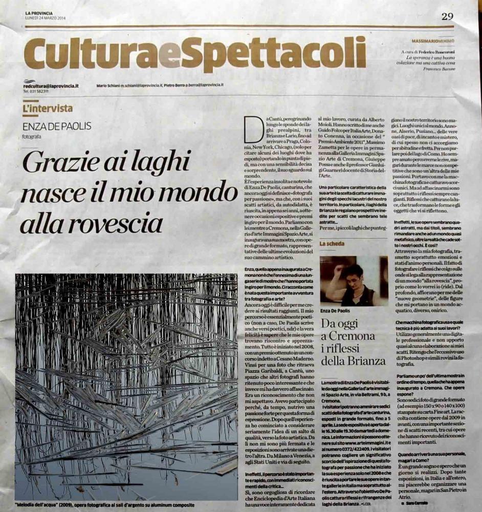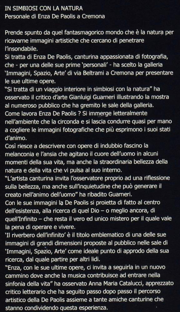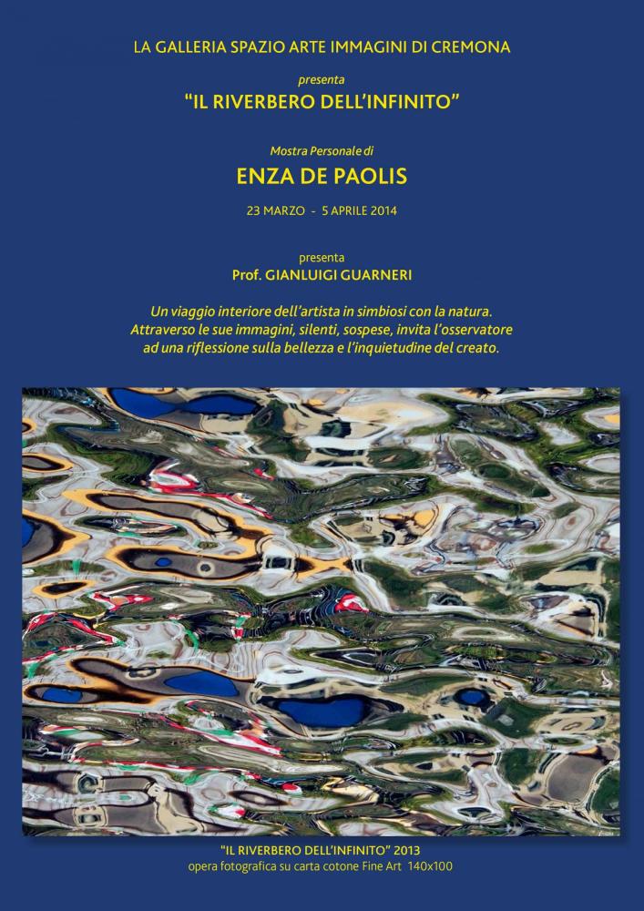 Il percorso ideativo di Enza De Paolis, trova il suo continuum figurativo tenso - meditativa. " Liquide superfici " , è il titolo dell'evento culturale,restimone del metafisico viaggio dell'artista nelle venature più recondite e nascoste dell'immagine .L'unicità della natura , il suo divenire, sono per Enza fonte di nutrimento per dell'anima, pura ispirazione di rigenerata interiorità , meditata riflessione sull'esistenza e dal suo desiderio di comunicare , per lasciare una traccia indelebile delle sue immagini , che appaiono come vere testimonianze della contemporaneità . Esplora nuovi linguaggi determinativi , mediati tra conoscenze tecniche ed esperienze visive. Un immediatezza sintetica , traspare dalle opere dell'artista, divenendo sensibile voce ed essenza dell'essere, trasmigrazione di energie, linfa vitale dell'anima . Lo spazio reale, diviene per Enza De Paolis , lo spazio di un " RIVERBERO INFINITO ", l'invisibile, il visibile,attraverso una " METAMORFOSI " di forme embrionali che sublimano in essenze liriche al di là del tempo .