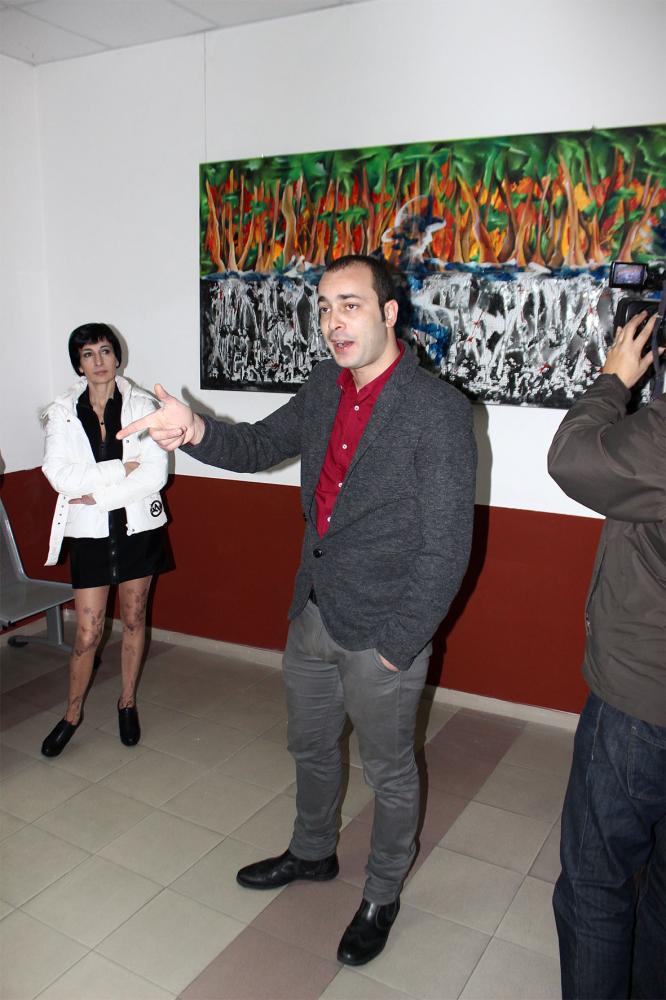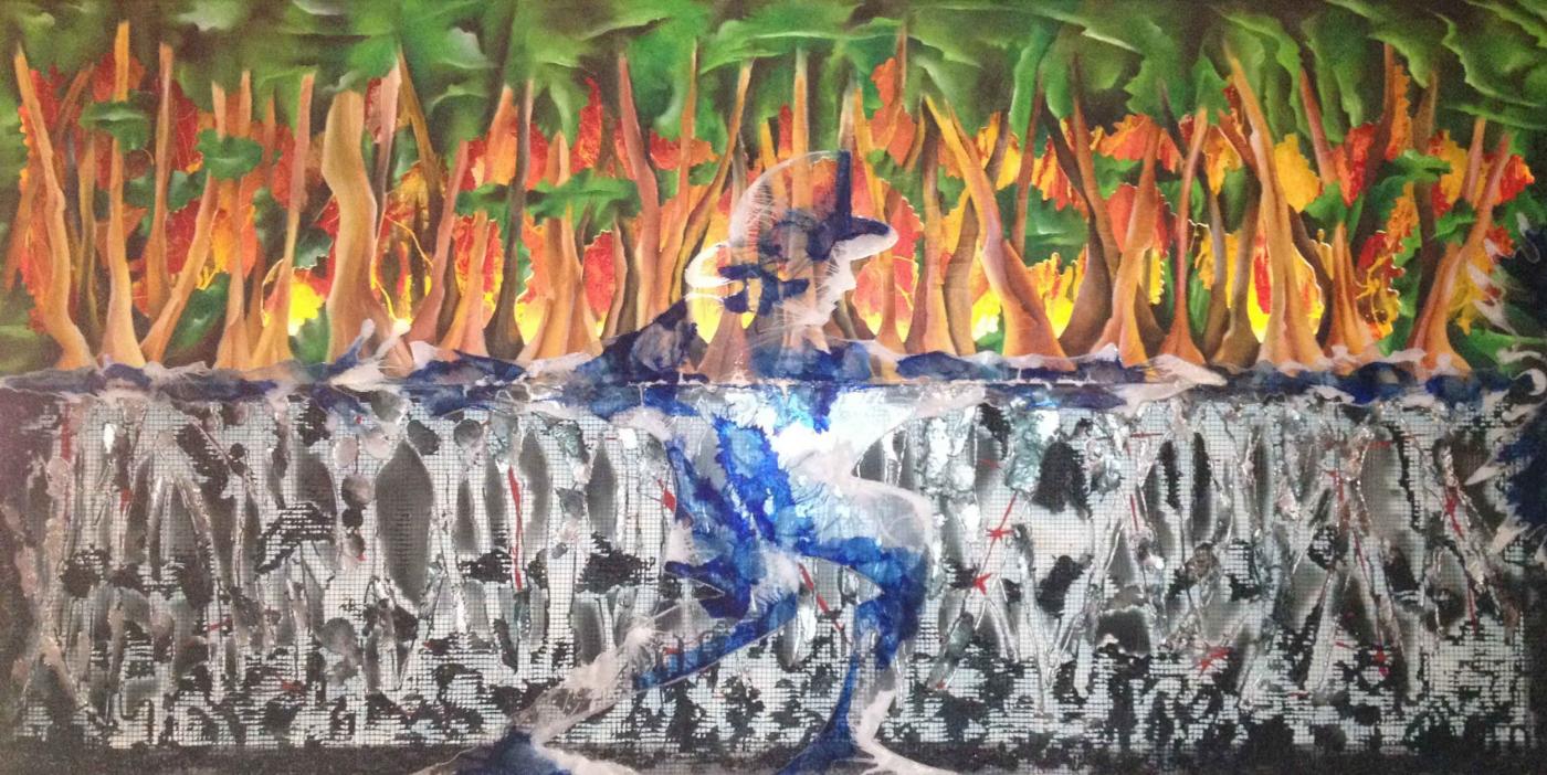 L’opera, Percorsi di Energia, è sviluppata su due registri, quello superiore è un mondo in fiamme dato per analogia attraverso un bosco che si concretizza nella sua materia propria, il legno; quello inferiore è la corruttibilità della città contemporanea che degrada verso un consumo sempre crescente che la corrode interamente mostrandone l’osso, fin dentro le mura dei palazzi, oltre il rivestimento esterno del cemento, l’anima in ferro ormai sciolta.