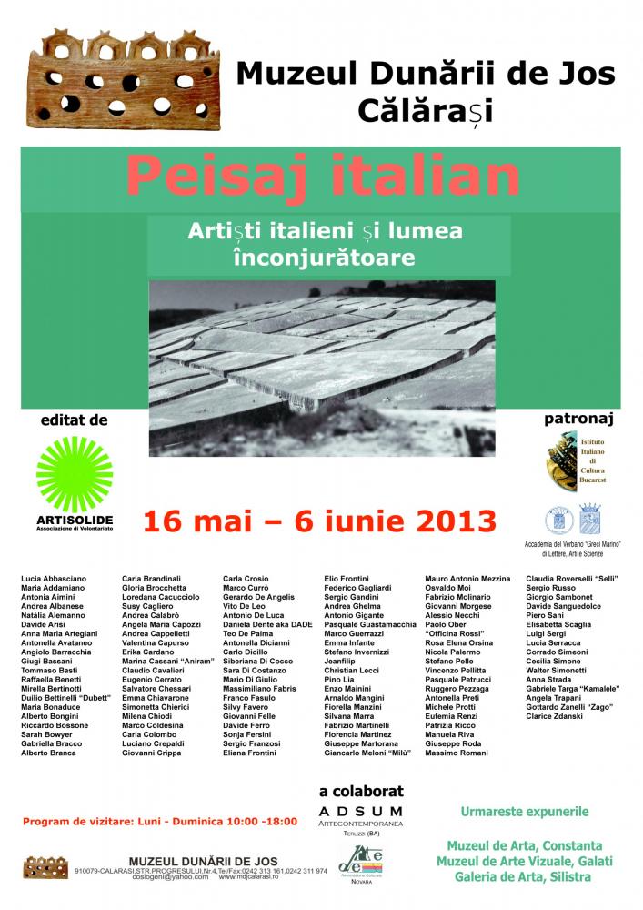 Il progetto espositivo "Paesaggio italiano", proposto dall'Associazione Artisolide, riunisce opere di artisti italiani rappresentativi di tutto il nostro territorio, interessati a parlare, attraverso le loro ricerche, dei luoghi in cui vivono e degli effetti e cambiamenti che tali ambienti stanno subendo e hanno subito nel corso degli anni. Una contaminazione di generi e proposte che dà luogo a questa singolare esposizione itinerante in 6 musei della Romania e Bulgaria, dal paesaggio industriale e urbano a quello rurale, rivissuto attraverso un percorso di dipinti, fotografie e lavori plastici aventi come unico denominatore comune il formato di cm. 40x40.
