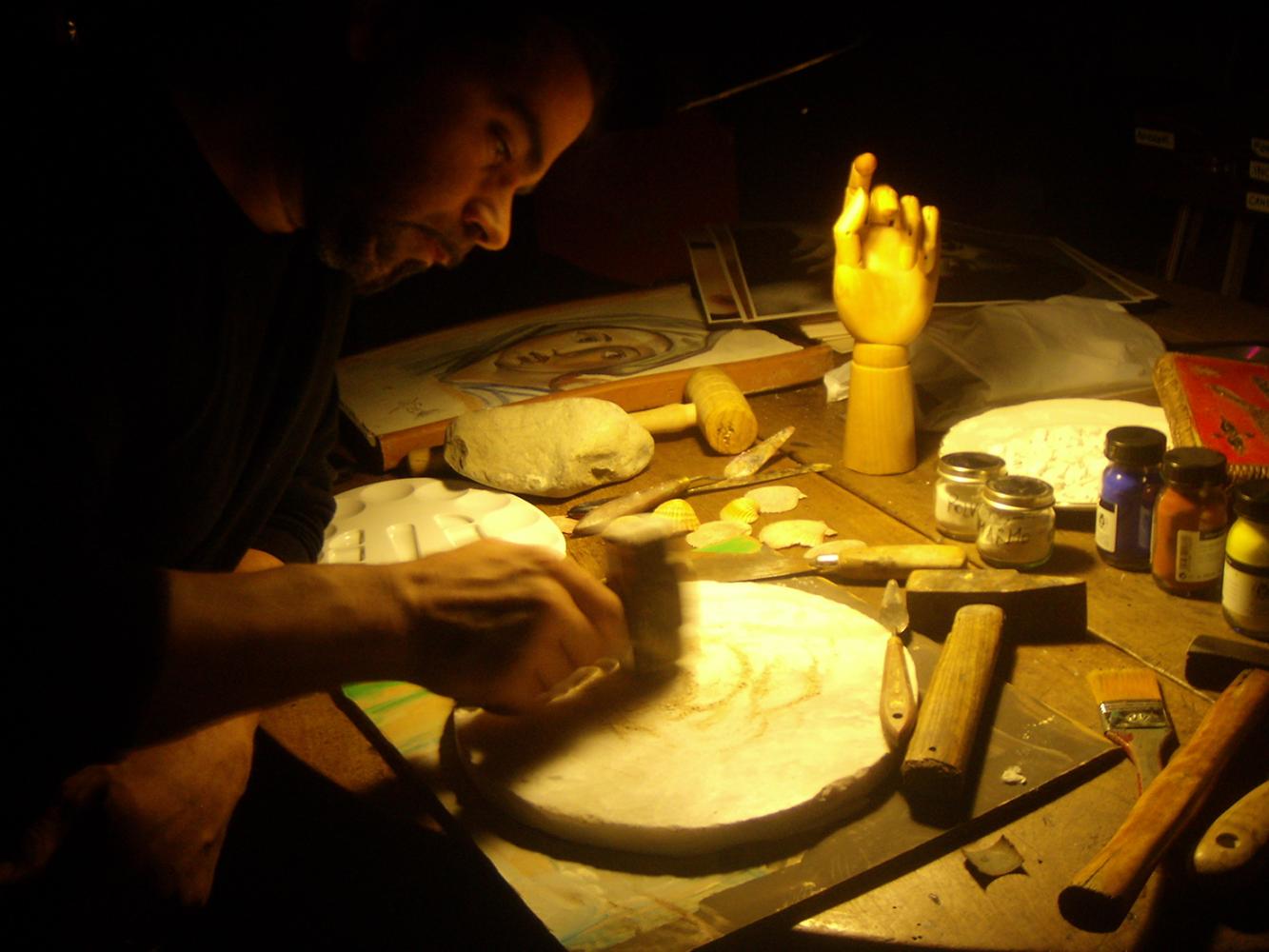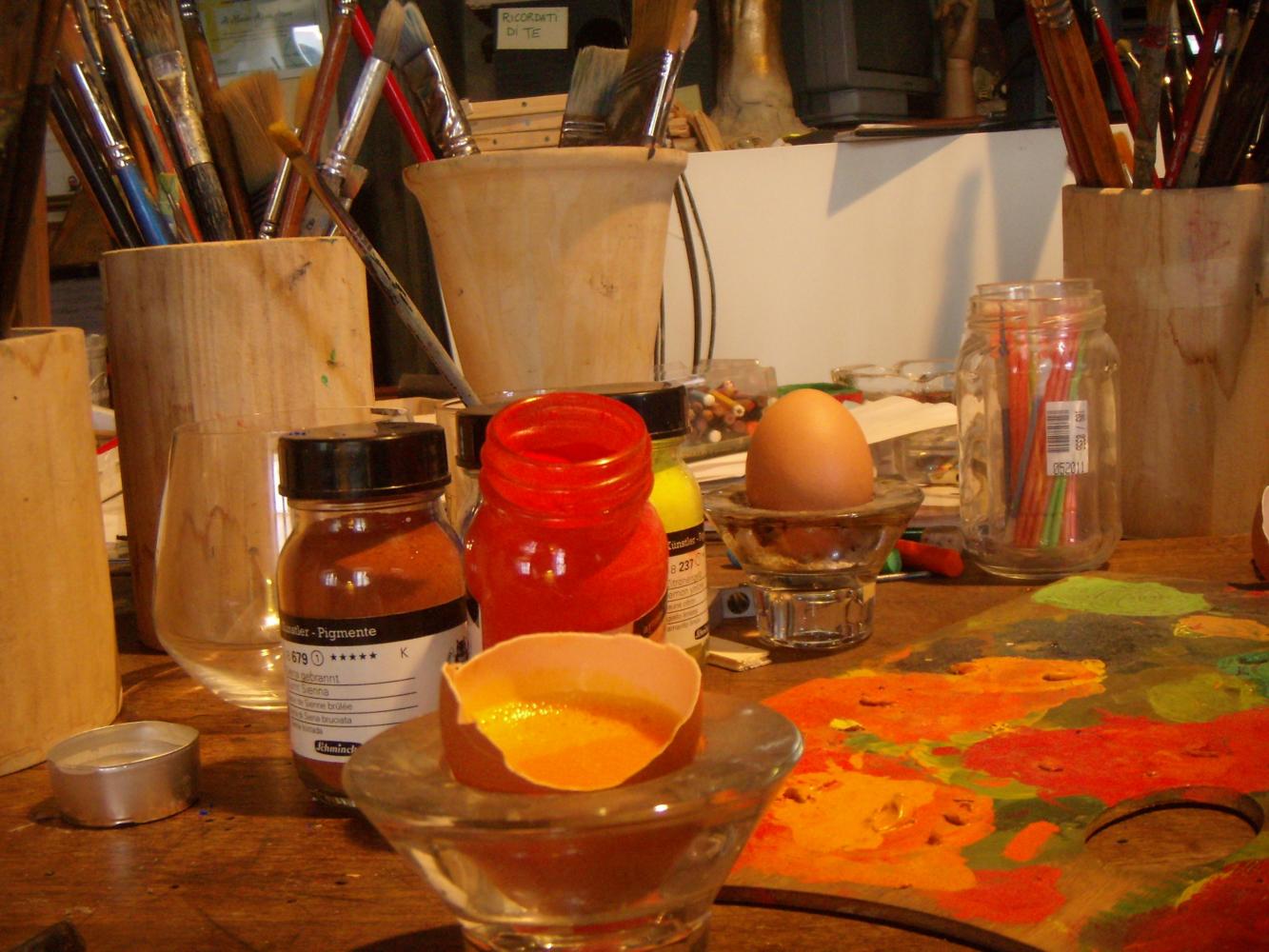 cenni sulla preparazione della tavola per la tempera all’uovo, sullo spolvero, sulla preparazione dei pigmenti e la realizzazione della propria opera pittorica eseguita