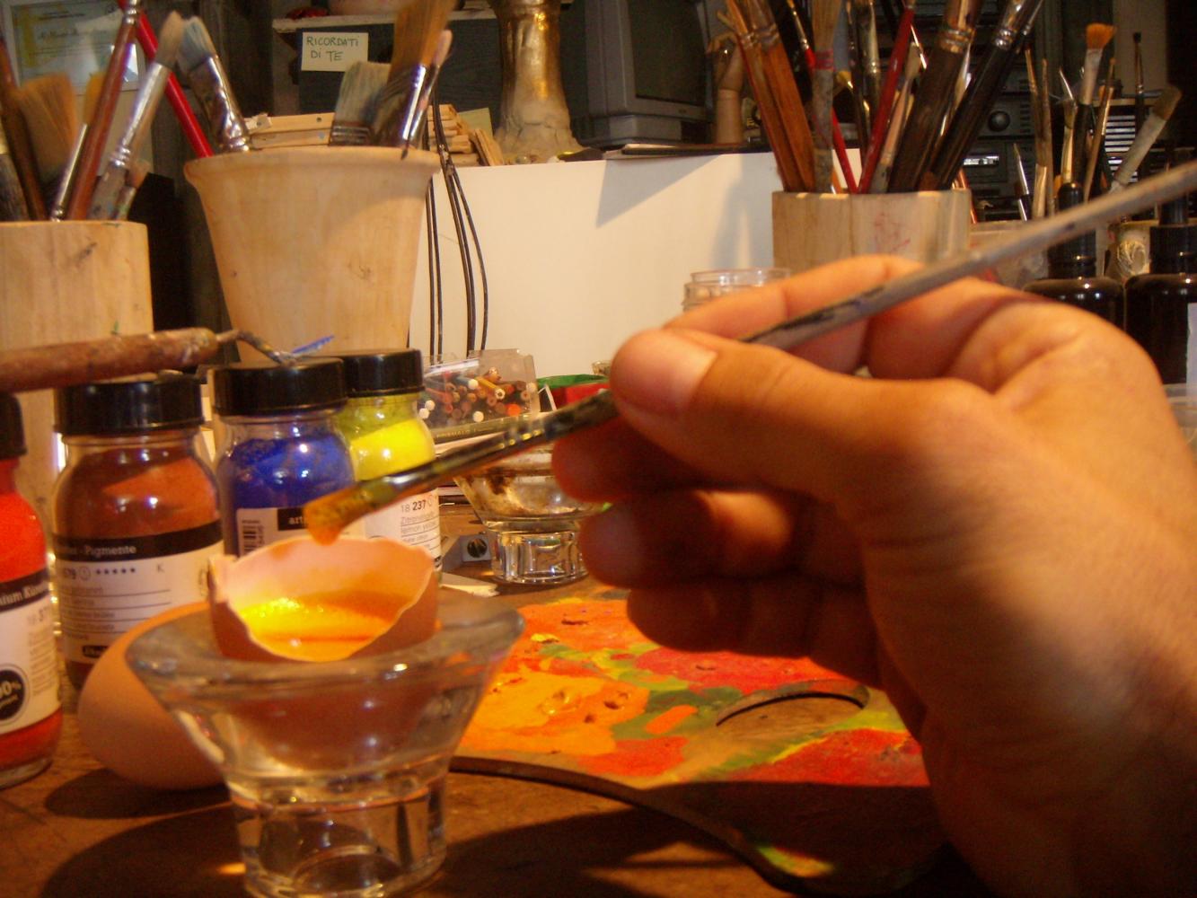a tempera all’uovo, o mista, secondo le antiche ricette e le miscele rinascimentali.