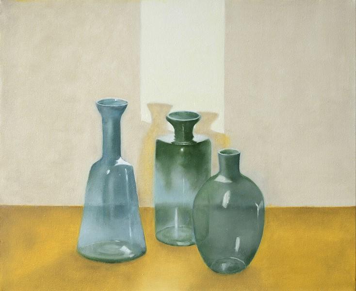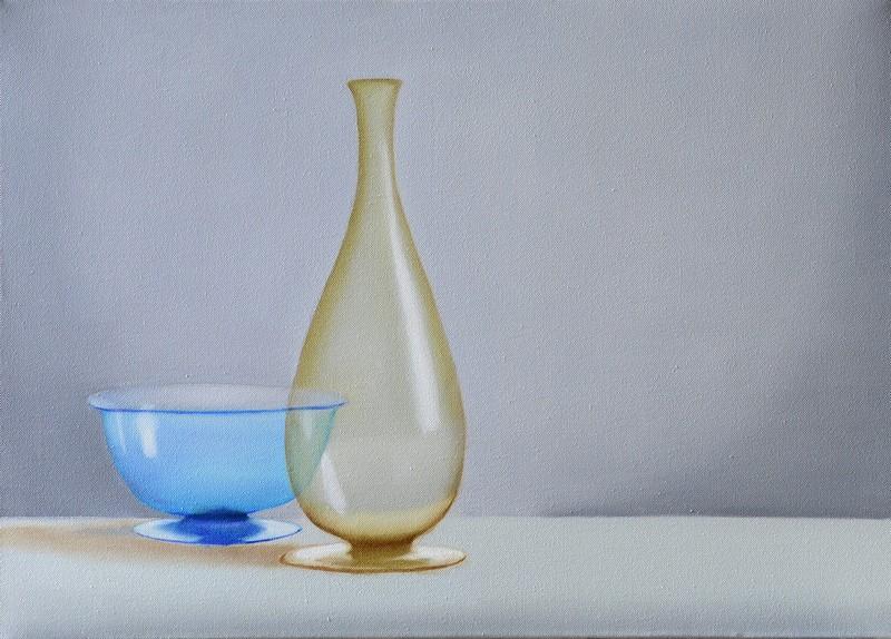 «Forme d’aria, scrive la curatrice, composizioni di vetri e cristalli su fondi neutri, realizzate con calma, nel tempo. Tempo lungo d’esecuzione in cui il gesto, modulato e reiterato, diventa il viatico per una profonda introspezione. A seguire, il tempo della visione, che non può essere fuggevole – in questo caso si coglierebbe solo l’abilità nell’uso della tecnica classica dell’olio su tela nella riproduzione di vasi Venini e vetri artistici di Murano – ma concentrata, per apprezzare il peso impalpabile della luce. Come per Giorgio Morandi, coppe e bottiglie non sono semplici contenitori, ma oggetti evocativi, a carattere magico e ipnotico. In un’atmosfera silenziosa e contemplativa l’osservatore, così come il pittore, si domanda quale sia il colore del vetro, ovvero quali siano i pigmenti che, una volta mescolati e dosati, possano restituire limpidamente il sentimento del visibile».