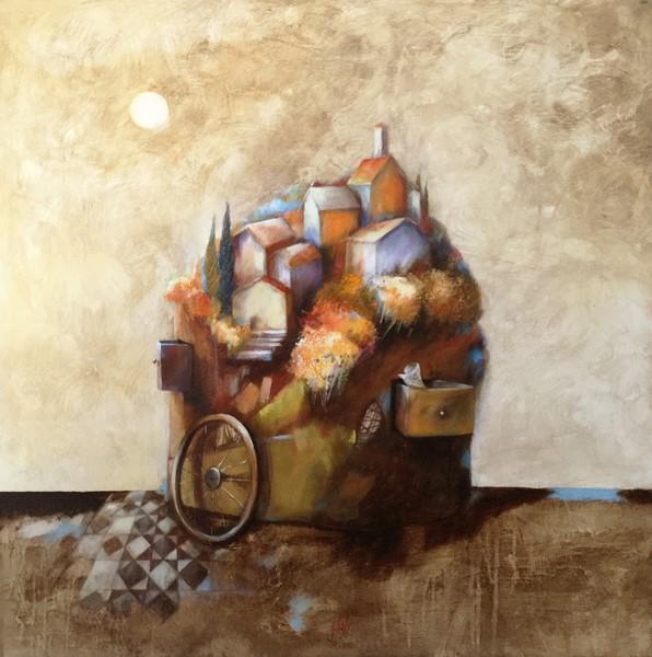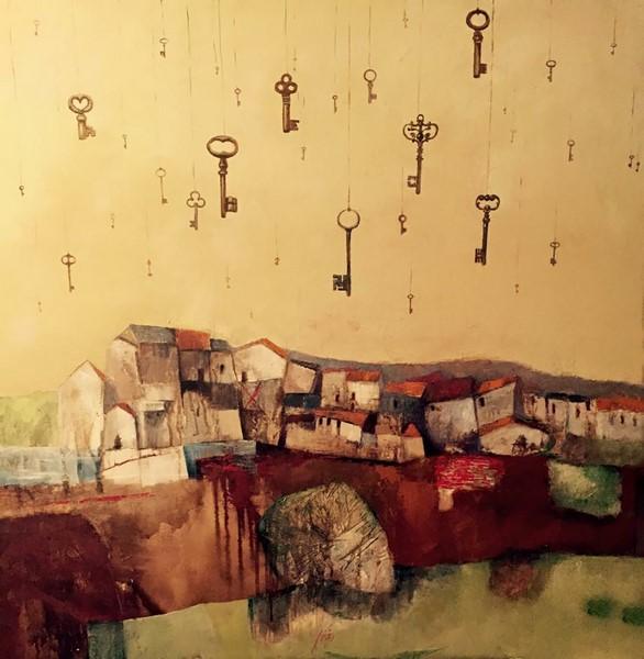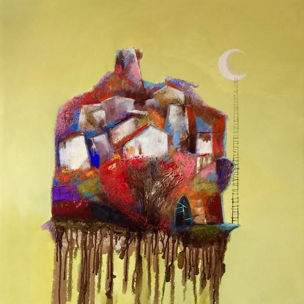 «Un percorso – spiega l’artista – tra paesaggi onirici e visionari, necessità di galleggiare in un mondo parallelo, in cui trovare rifugio sicuro, arroccati su monoliti viaggianti o piattaforme sospese come nelle città di Calvino, sfuggenti scenari che danno infinite possibilità alla mente che non trova capacità oggettive in questa realtà rifiutata. L’intento è mettere toppe all’anima, ricamando ad occhi aperti nuovi sogni più leggeri».