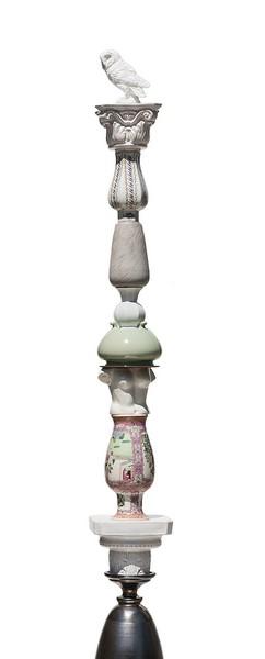 Osservando le Cariatidi, lo sguardo corre sino al culmine dell’opera, attraverso un’ascensione metaforica generata dalla reale sovrapposizione di elementi dal forte valore simbolico, tra ready made e scultura: il vaso come contenitore di esperienze, le colonne antiche come fondamenta delle diverse culture, le statue classiche come rappresentazione della bellezza e della perfezione, la civetta come simbolo della conoscenza con riferimenti alla vanitas e alla tematica del memento mori.