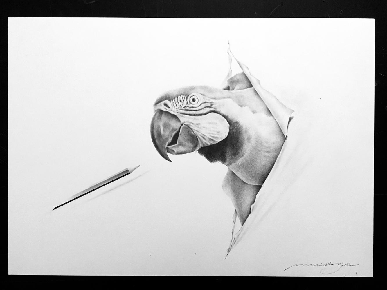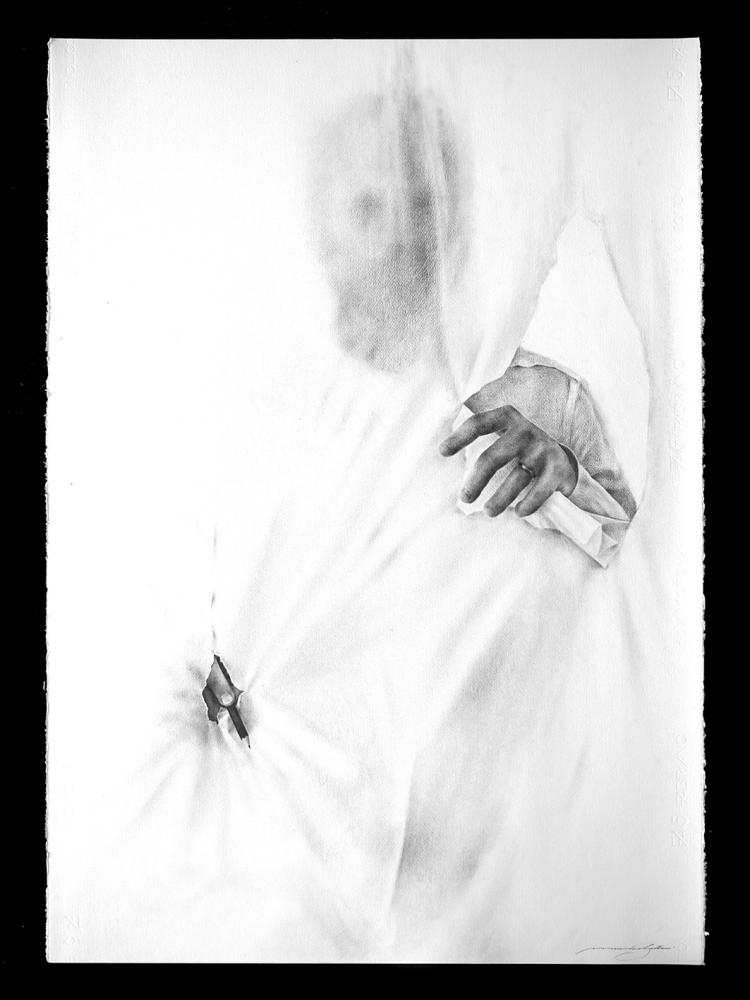 «Massimiliano Galliani – si legge nel testo di Vera Agosti – dedica una nuova serie di disegni al tema dell’Attraverso. Ciò che si oltrepassa non è uno specchio, come nell’opera letteraria di Lewis Carroll, né la superficie specchiante nera e lucida che l’artista aveva utilizzato in precedenza per i suoi ritratti al nero, bensì un foglio di carta trasparente e illusorio, ovvero accennato nel disegno, tramite alcuni espedienti tecnici, quali il tratto leggerissimo e delicato, che va a definire solo determinate porzioni della figura, senza tracciarne la totalità del contorno, come nell’“Autoritratto”. Il corpo pare appoggiarsi alla carta, lasciando il segno di una pressione momentanea, come una sindone effimera […]. L’artista suggerisce volontariamente e con successo l’idea della trasparenza dando prova di un’eccellente abilità tecnica. È una caratteristica che da sempre accompagna l’arte italiana: ricordiamo per esempio la raffigurazione della brocca d’acqua nel “Cenacolo” di Leonardo da Vinci o i veli in marmo nel “Cristo velato” di Giuseppe Sanmartino. Altri artisti contemporanei ricercano la trasparenza con i materiali più svariati, dal vetro alle resine e alle plastiche, fino alla luce, elemento decisivo e dominante anche nei disegni di Massimiliano […]. L’idea dell’artista è personalissima e originale, semplice e brillante per un esito essenziale e pulito nel candore del bianco del foglio. Parte dalla riflessione sulla serie “disegno E matita” del 2017, dove la punta del lapis disegnato va ironicamente a bucare il foglio, oltre che a ritrarre i più diversi animali, da quelli domestici a quelli feroci, nonché insetti. Ecco quindi un formichiere, un bruco, un ragno, una mantide..., delineati con un tratto sicuro e impeccabile. La matita si sostituisce al dito di Dio nella creazione degli esseri viventi, rimarcando l’artificio e il ruolo di libero e onnipotente demiurgo dell’universo creativo […]. L’arte come liberazione. Nel nuovo “Autoritratto” Massimiliano sta cercando di uscire da una barriera. Allo stesso modo il cane feroce esce dalla carta perché vorrebbe prendere la matita che l’ha disegnato. È una rappresentazione dell’energia e della voglia di vivere. Così ha raccontato l’artista stesso in una recente intervista a “Il Resto del Carlino”, questi disegni sono una metafora della sua paura interiore, frutto di un avvenimento personale importante e difficile, che viene proiettata all’esterno e trasformata in bellezza, positività e amore. L’arte come terapia, in cui la mano e la matita diventano gli psicologi. In ultimo, resta soltanto il foglio di carta squarciato nel gioco del chiaroscuro […]».