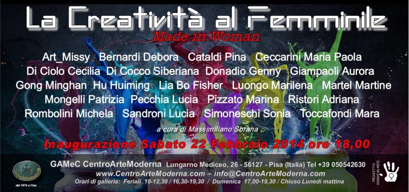 Si inaugurerà Sabato 22 Febbraio 2014 alle ore 18,00 presso gli storici spazi espositivi del CentroArteModerna di Pisa (Lungarno Mediceo,26) la mostra "La Creatività al Femminile / Made in Woman " a cura di Massimiliano Sbrana (fino al 5 Marzo con ingresso libero).