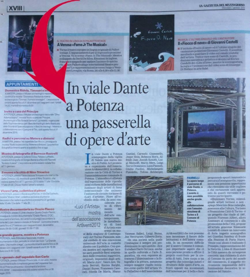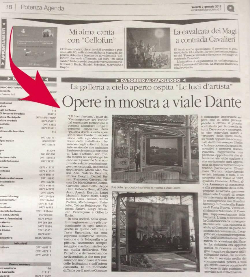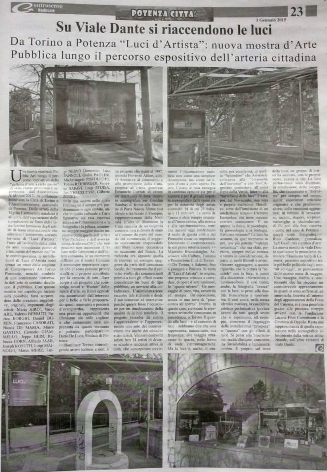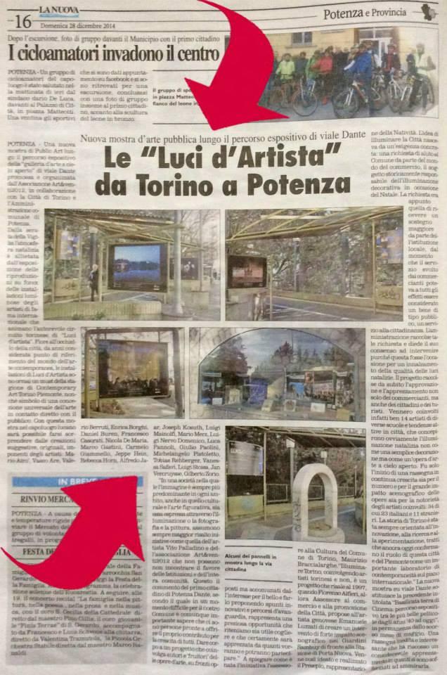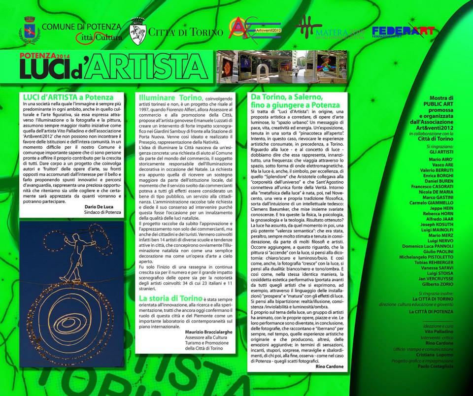Luci d’Artista nasce in origine come una proposta artistica a corredare, di opere d’arte luminose, lo “spazio urbano” spiega il critico d’arte e giornalista Rino Cardone che aggiunge “ Un messaggio di pace, vita, creatività ed energia. Un’esposizione, tenuta in una sorta di “pinacoteca all'aperto”. Intento, in questo caso, rievocare le esperienze artistiche consumate, in precedenza, a Torino. Riguardo alla luce - e al concetto di luce - dobbiamo dire che essa rappresenta, innanzitutto, una frequenza: che viaggia attraverso lo spazio, sotto forma di onde elettromagnetiche. Ma la luce è, anche, il simbolo, per eccellenza, di quello “Splendore” che Aristotele collegava alla “corporeità dell’universo” e che Sant’Agostino connetteva all'unica fonte della Verità. Intorno alla “metafisica della luce” è nata, poi, nel Novecento, una vera e propria tradizione filosofica, sorta dall'intuizione di un intellettuale tedesco: Clemens Baeumker, che mise insieme svariate conoscenze. E tra queste: la fisica, la psicologia, la gnoseologia e la teologia. Risultato ottenuto? La luce ha assunto, da quel momento in poi, una più potente “valenza semantica”: che era stata, peraltro, sempre molto stimata e tenuta in considerazione, da parte di molti filosofi e artisti. Occorre aggiungere, a questo riguardo, che la pittura si “accende” con la luce, si pensi alla dicotomia: chiaro/scuro e luminoso/buio. E così come, anche, la fotografia “cresce” con la luce, si pensi alla dualità: bianco/nero e tono/ombra. E così come, nella stessa identica maniera, la cosiddetta estetica performativa (portata avanti da tutti quegli artisti che si esprimono, ad esempio, attraverso il linguaggio delle installazioni) “prospera” e “matura” con gli effetti di luce. Si pensi alla bipartizione: realtà/illusione, consistenza /inviolabilità e luminosità/ombra. E proprio sul tema della luce, un gruppo di artisti ha animato, con le proprie opere, piazze e vie. Le loro performance sono diventate, in conclusione, delle fotografie, che raccontano e “ibernano” per sempre, nel tempo, quelle esperienze artistiche originarie e che producono, altresì, delle emozioni aggiuntive; in termini di sensazioni, incanti, stupori, sorprese, meraviglie e sbalordimenti, di chi poi, alla fine, osserva - come nel caso di Potenza - quegli scatti fotografici.>>.