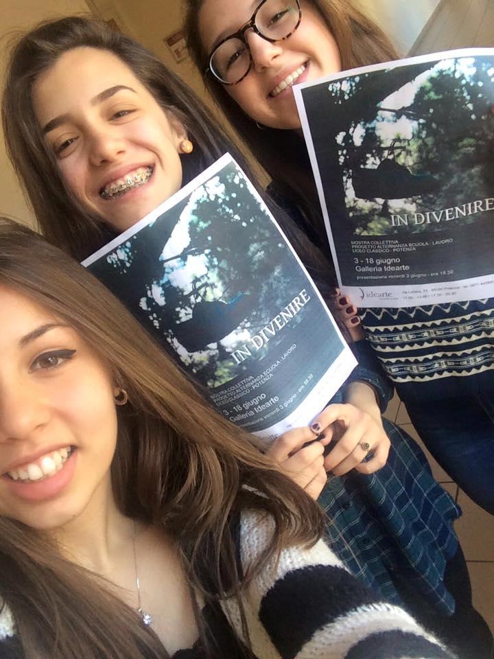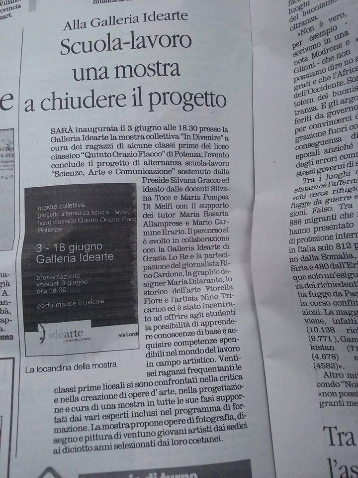 Si inaugura il 3 giugno 2016 alle ore 18:30 presso la Galleria Idearte la mostra collettiva “In Divenire” a cura dei ragazzi di alcune classi prime del liceo classico “Quinto Orazio Flacco” di Potenza; l’evento conclude il progetto di alternanza scuola-lavoro “Scienze, Arte e Comunicazione” sostenuto dalla Preside Silvana Gracco ed ideato dalle docenti Silvana Toce e Maria Pompea Di Melfi con il supporto dei tutor Maria Rosaria Allamprese e Mario Carmine Erario. Il percorso si è svolto in collaborazione con la Galleria Idearte di Grazia Lo Re e la partecipazione del giornalista Rino Cardone, la graphic designer Maria Ditaranto, lo storico dell’arte Fiorella Fiore e l’artista Nino Tricarico ed è stato incentrato ad offrire agli studenti la possibilità di apprendere conoscenze di base e acquisire competenze spendibili nel mondo del lavoro in campo artistico. Ventisei ragazzi (Ilaria Aurora Atena, Angela Bisaccia, Sara Brienza, Francesca Bufo, Valeria Capobianco, Andrea Caramia, Laura Ciardullo, Raffaele Claps, Annamaria D’Andrea, Eleonora Di Leo, Alessandra Gigliotti, Michela Guerrieri, Gaia La Vecchia, Martina Langone, Noemi Lovallo, Mariarosaria Marino, Rossella Pace, Francesca Rondanini, Silvia Rossi, Laura Sabia, Noemi Sangiacomo, Maria Teresa Sassano, Alessandro Vertone, Lorenza Vertone, Martina Villano, Roberta Zuardi) frequentanti le classi prime liceali si sono confrontati nella critica e nella creazione di opere d’arte, nella progettazione e cura di una mostra in tutte le sue fasi supportati dai vari esperti inclusi nel programma di formazione.