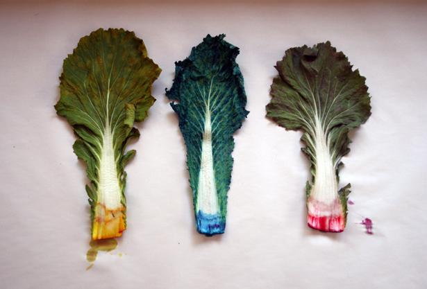 Mwaba's second project on display is Chinese Cabbage, which examines the effects on Zambia of Chinese economic colonization that is evident in the transformation of agriculture and the use of local natural resources, such as copper, cobalt and manganese. The artist uses Chinese cabbage as a laboratory-like test device and illustrates the process of transformation by putting three cabbage leaves in three separate plastic cups absorbing a coloured liquid, turning yellow, red and blue—according to the colours of the three Zambian resources—respectively while stems and veins remain white.