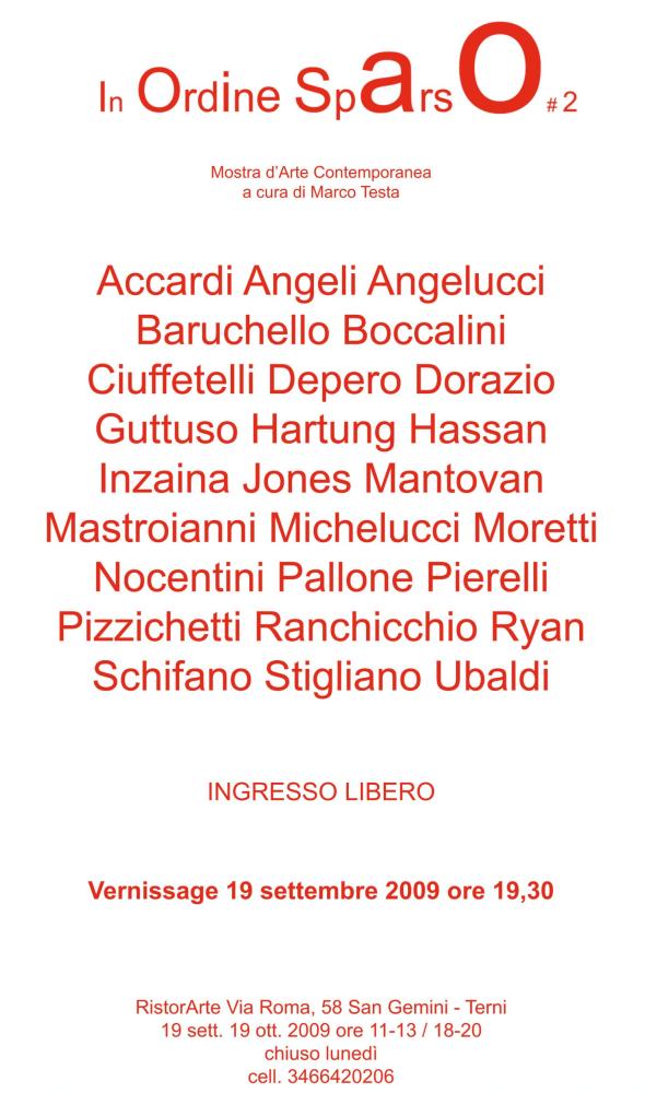 In Ordine Sparso # 2 vuole restituire la libertà di linguaggio, di pensiero, la libertà d’espressione - quella artistica - di chi ha voluto esprimere la sua arte con la grafica anziché con la pittura, di chi ha modellato il proprio pensiero, di chi ha voluto estendere la gestualità del proprio braccio su una superficie, rappresentando visivamente la propria emozione.Tra gli artisti c’è chi lascia ampie bianche campiture: anche il deserto vuoto, che circonda il “vero” lavoro, ha il suo prezzo. La provocazione artistica sollecita un mondo in decadenza di valori e di idee, sprona a risollevare e a trovare - anche nel Kaos del cambiamento - quell’emozione, quell’appagamento, quell’equilibrio “naturale” che quotidianamente viene messo in discussione e viene destabilizzato proprio dalla ricerca di certezze in quel dettaglio che, seppur evanescente, è così essenziale per essere in linea con gli altri: come si fosse di fronte ad un quadro fuori centro, da raddrizzare, perché giudicato “inadeguato”.