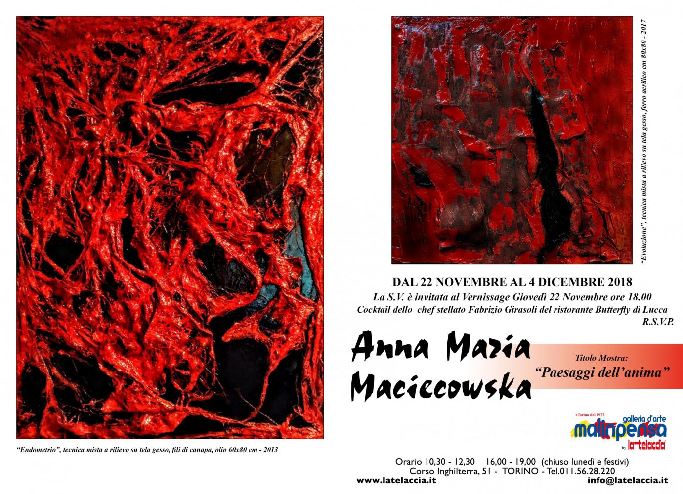 Mostra personale alla Galleria d'arte Malinpensa By La Telaccia del'artista Anna Maria Maciechowska dal 23novembre al 4 dicembre. Mostra e presentazione critica a cura di Monia Malinpensa. Inaugurazione 22 novembre ore 18 . In occasione cocktail preparato dello chef stellato Fabrizio Girasoli del Ristorante Butterfly di Lucca.