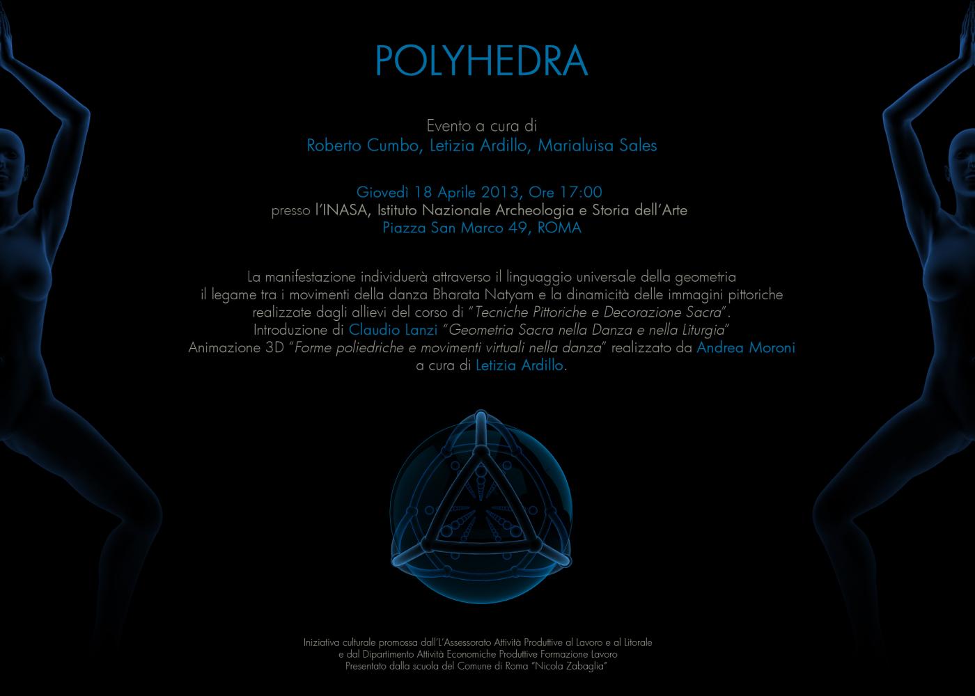 L’Assessorato Attività Produttive al Lavoro e al Litorale, il Dipartimento Attività Economiche Produttive Formazione Lavoro, la scuola del Comune di Roma “Nicola Zabaglia” insieme all’Associazione Orchestès ha presentato “Polyhedra”, evento curato da Roberto Cumbo, Letizia Ardillo e Marialuisa Sales. La manifestazione individua nel linguaggio universale della geometria sacra le connessioni tra i movimenti della danza Bharata Natyam e la dinamicità delle immagini pittoriche realizzate dagli allievi del corso di “Tecniche Pittoriche e Decorazione Sacra”, attraverso una mostra ed un video realizzato da Andrea Moroni e ideato da Letizia Ardillo. L’ing. Claudio Lanzi (presidente dell'Associazione Simmetria), in occasione della pubblicazione del testo Polyhedra del grande artista e matematico scomparso Adriano Graziotti, ha introdotto la manifestazione, illustrando alcuni aspetti della simbologia della Danza Sacra in relazione alla Geometria Arcaica. Dimostrazione di danza a cura di Alessio Giannachi, Marzia Colitti e Marialuisa Sales. Foto: Merionj Barbieri.