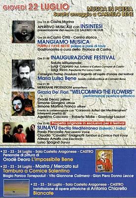 Grazie all'intelligenza di CLAUDIO "CAVALLO" GIAGNOTTI dei Mascarimirì ideatore del Festival, il 22 luglio alle ore 21,30, io e l'attore SIMONE FRANCO realizzeremo la performance poetica-pittorica "GRAZIA DE' FIORI WELCOMING THE FLOWERS", ispirata al poema capolavoro di Carmelo Bene "'l mal de' fiori".
