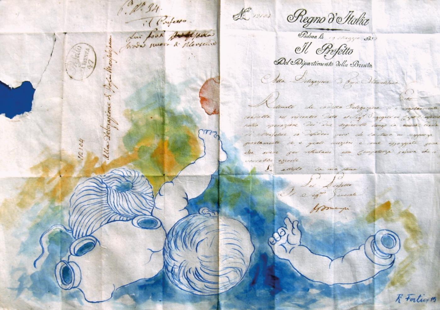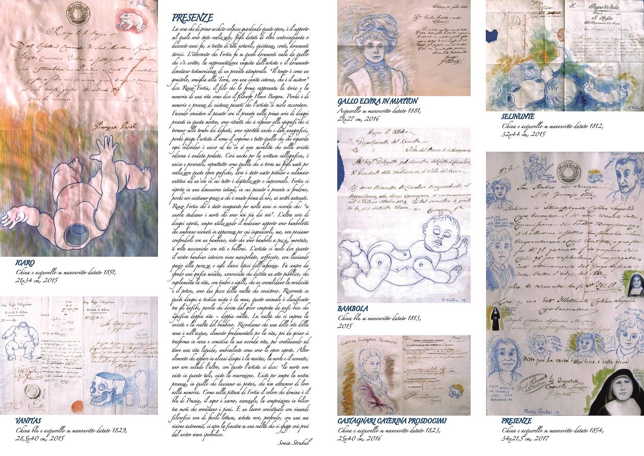 “Il tempo è come un gomitolo, somiglia alla Terra, con una cavità interna, che è il mistero” dice Renzo Fortin, e sono proprio le memorie e le presenze di esistenze passate che hanno ispirato le opere grafiche dell’artista. Già conosciuto e apprezzato per i suoi romantici paesaggi notturni, in “Presenze” Renzo Fortin si cimenta nel disegno e realizza ritratti ispirati ad epigrafi poste sulle tombe dei defunti, di cui riporta i dati anagrafici. Ma anche bambole a pezzi, smontate, a volte meccaniche con viti e bulloni. Particolare anche il supporto sul quale sono state realizzate: fogli datati di oltre centocinquanta o duecento anni fa, si tratta di atti notarili, quietanze, conti e documenti storici.