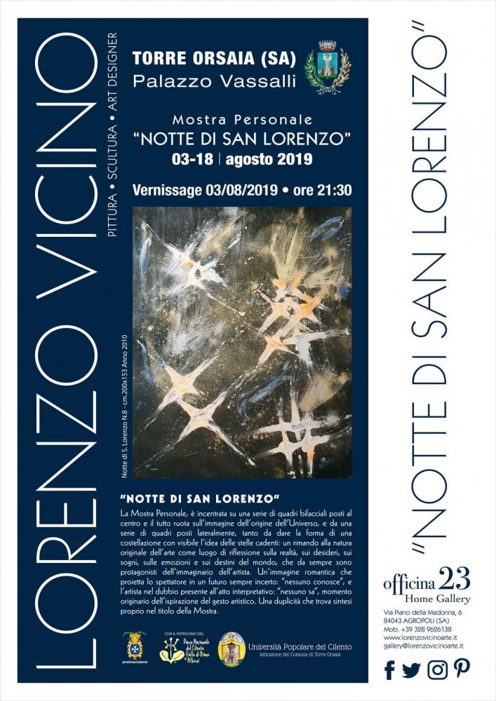 La Personale di Lorenzo Vicino, è incentrata su una serie di quadri bifacciali posti al centro e il tutto ruota sull’immagine dell’origine dell’Universo, e da una serie di quadri posti lateralmente, tanto da dare la forma di una costellazione con visibile l’idea delle stelle cadenti : un rimando alla natura originale dell’arte come luogo di riflessione sulla realtà, sui desideri, sui sogni, sulle emozioni e sui destini del mondo, che da sempre sono protagonisti dell’immaginario dell’artista. Un’immagine romantica che proietta lo spettatore in un futuro sempre incerto: “nessuno conosce”, e l’artista nel dubbio presente all’atto interpretativo: “nessuno sa”, momento originario dell’ispirazione del gesto artistico. Una duplicità che trova sintesi proprio nel titolo della Mostra.