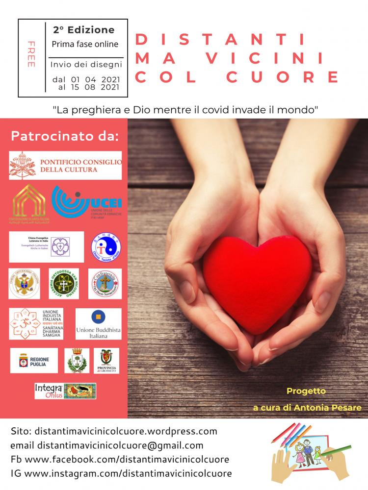 Scadenza: La foto del disegno deve essere inviata dal 1° aprile 2021 al 15 agosto 2021 all’indirizzo: distantimavicinicolcuore@gmail.com con la scheda di partecipazione comprensiva della liberatoria.