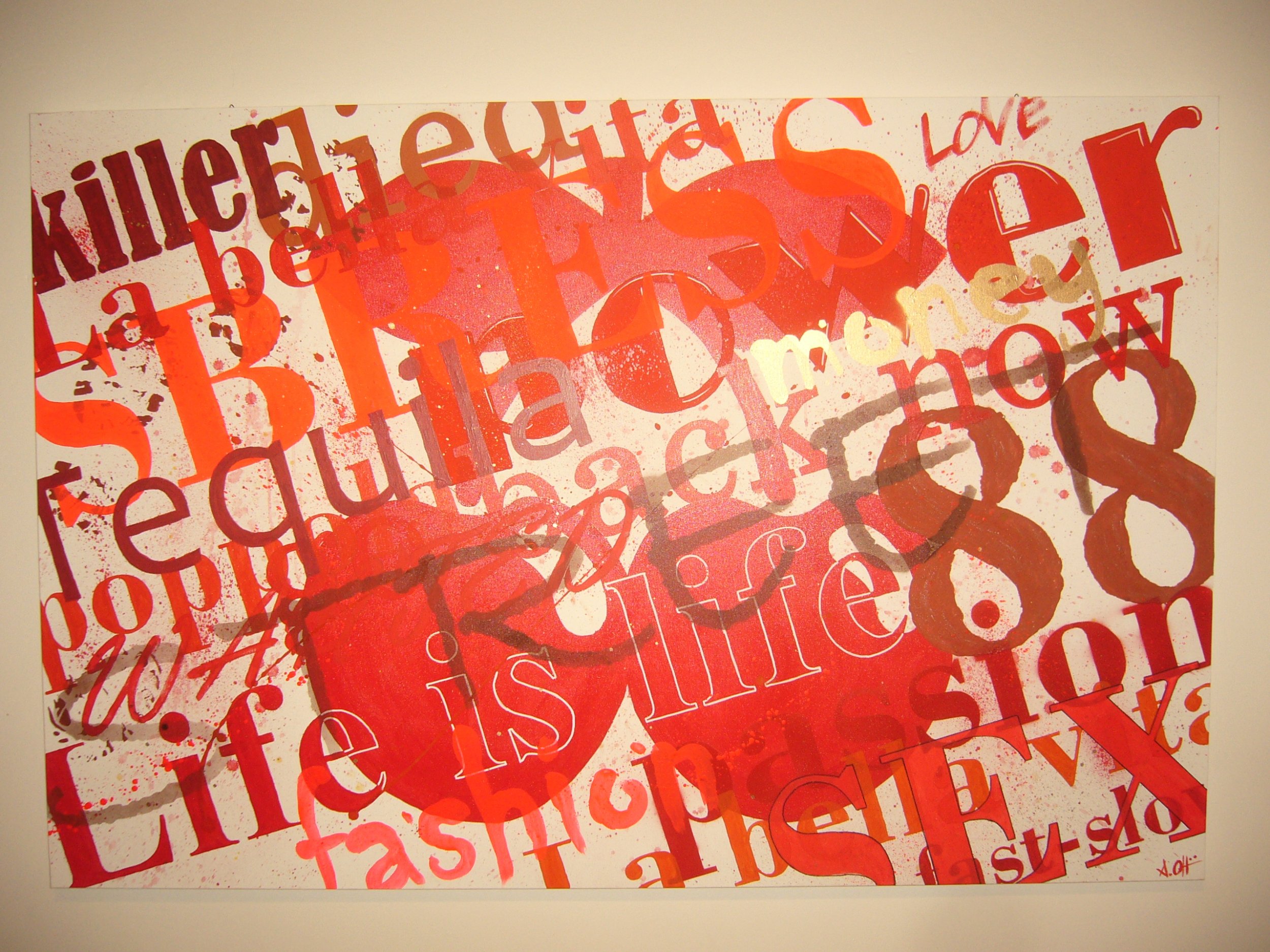 Sbress words Pittura, Simbolo / Lettera, Tecnica mista, 150x50cm Tela Tecnica mista lettere scritte Inserita 14 anni fa 2 Mi piace Non piace più 1 Commento 199 Visite Condividi Facebook Twitter Google + Piace a 2 Maria Gambacorta Artista - Arezzo mauro magri Premium Artista - Bologna Commenti 1 14 anni fa Andrea Oppici Artista Peccato che il flash rovina l'effetto dei colori e la diversità di materiali... Dal vivo rende meglio Inserisci commento E' necessario effettuare il login o iscriversi per inserire il commento Login