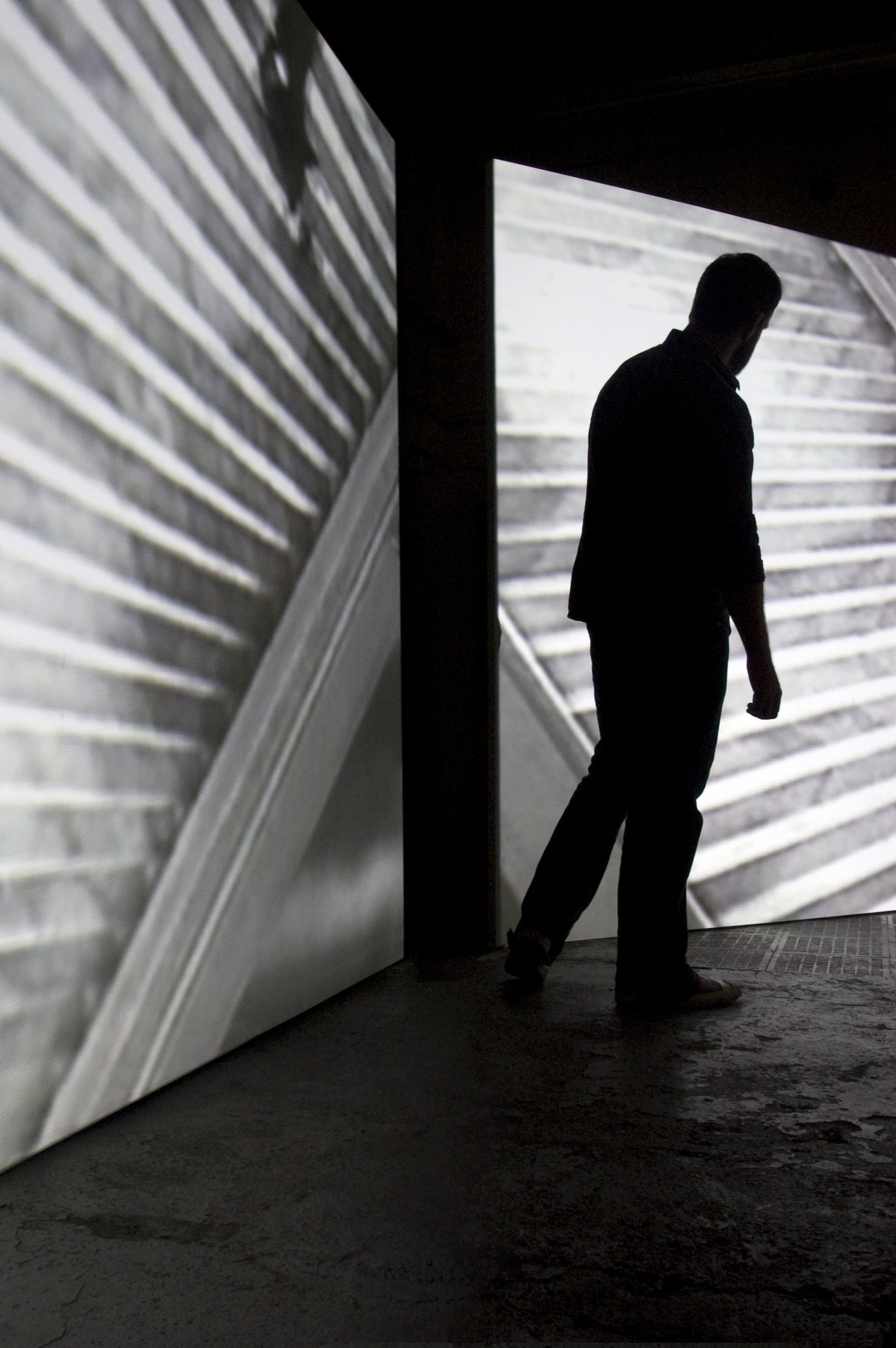 The theatrical experience becomes anti theatrical with the viewer led away from any temptation of narrative into an ever-renewing present. Joining the figure in his Sisyphean trap, the viewer becomes increasingly aware of their own body in the enclosed space; where ascent and descent merge together to create a confused and never-ending staircase, ultimately leading nowhere. Created, is a state in which time must be experienced as presence and where the boundaries separating polarities (life and death, reality and fiction, the known and the unknown) are questioned as these opposing states find their co existence.