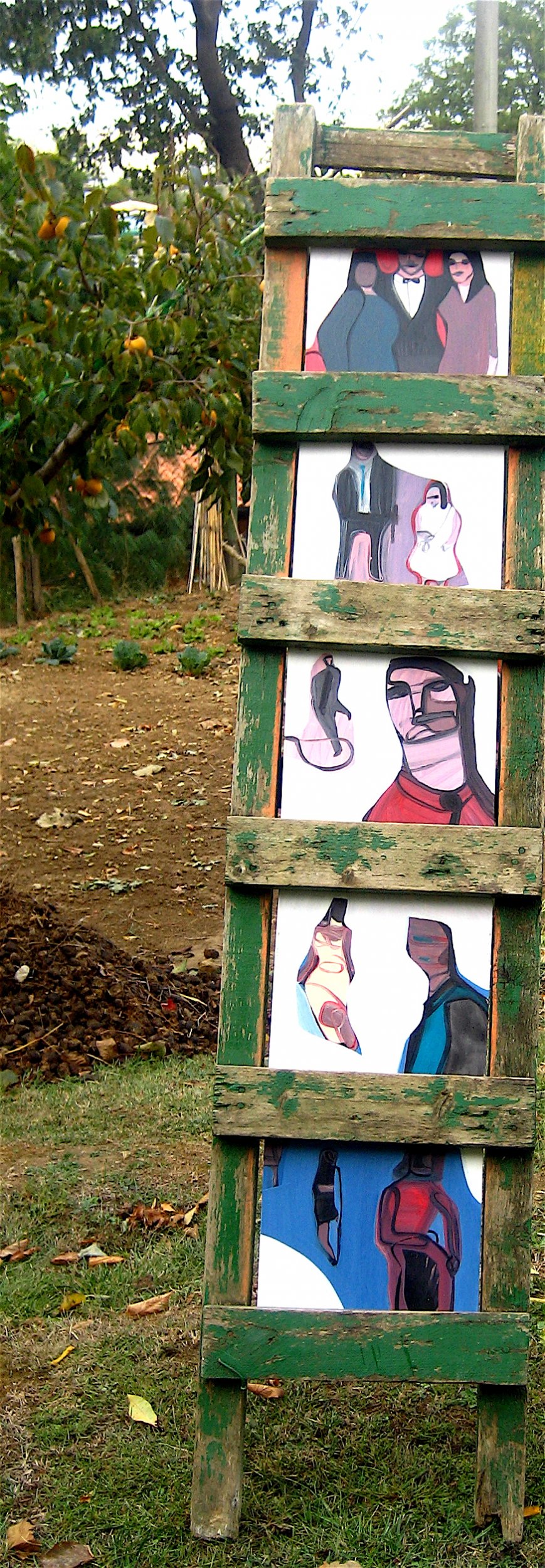 istallazione composta da una vecchia scala con inserimento di opere su tela raffiguranti scene di " momenti di un matrimonio "