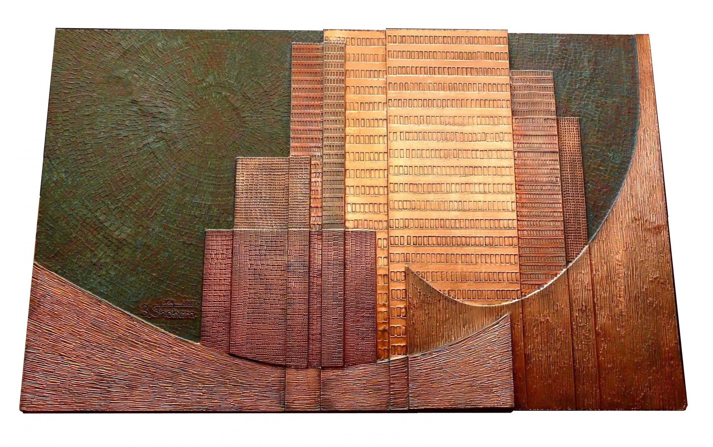 Constructions of different levels built on plates of wood, covered with thin sheets of metal (mostly copper & aluminum), textured, patinated and enameled. This unique technique, shows metal in a different and unusual way, was developed by the Chilean artist BENEDICTUS and is used only by himself and SHOHAM, his only student so far.