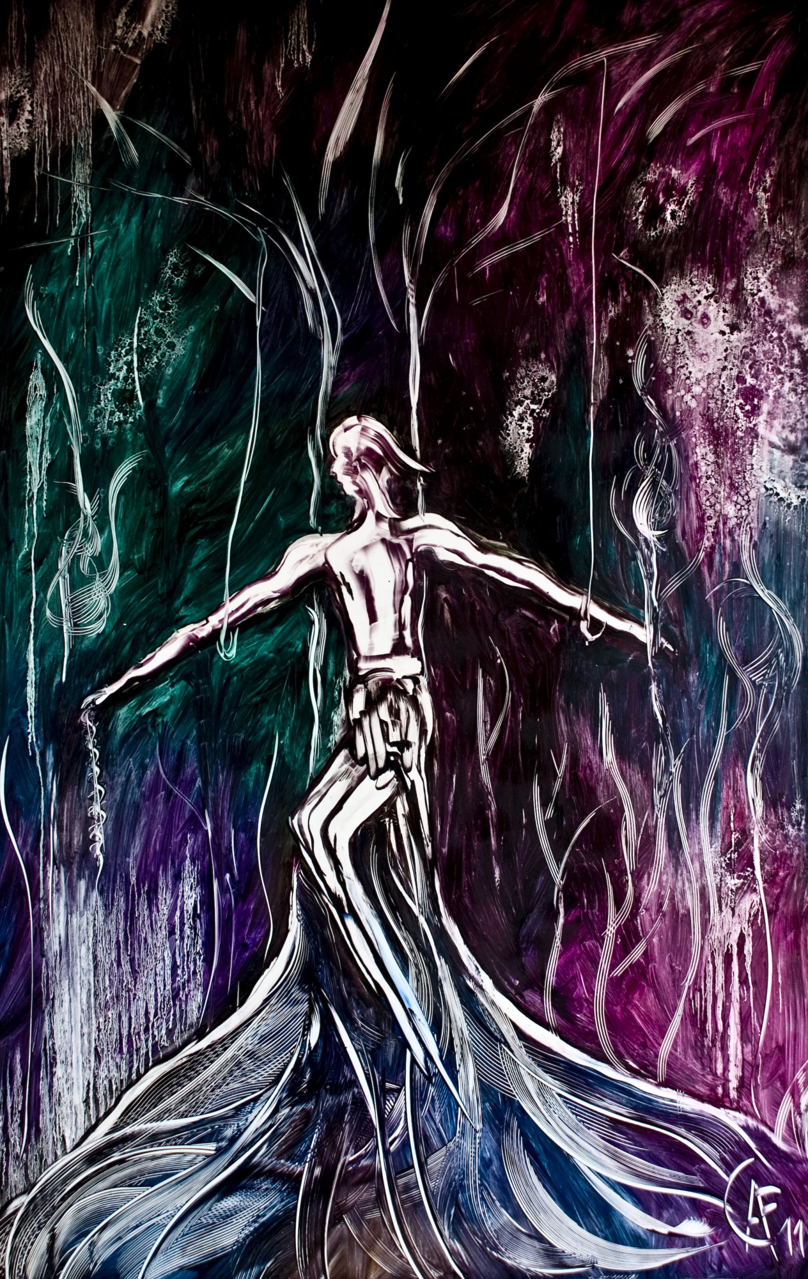 l'uomo contemporaneo che troviamo crocifisso in un albero,diventa il simbolo di una società morta priva di valori ed ideali, a differenza di una tradizionale iconografia cattolica della crocifissione in cui troviamo la madre di cristo , san giovanni e la maddalena e piangere il suo corpo morente, qui notiamo l'incombente solitudine , pervasa da odio altrui e triste agonia dell'uomo di oggi,il tutto enfatizzato da un cromatismo drammatico e oscuro.