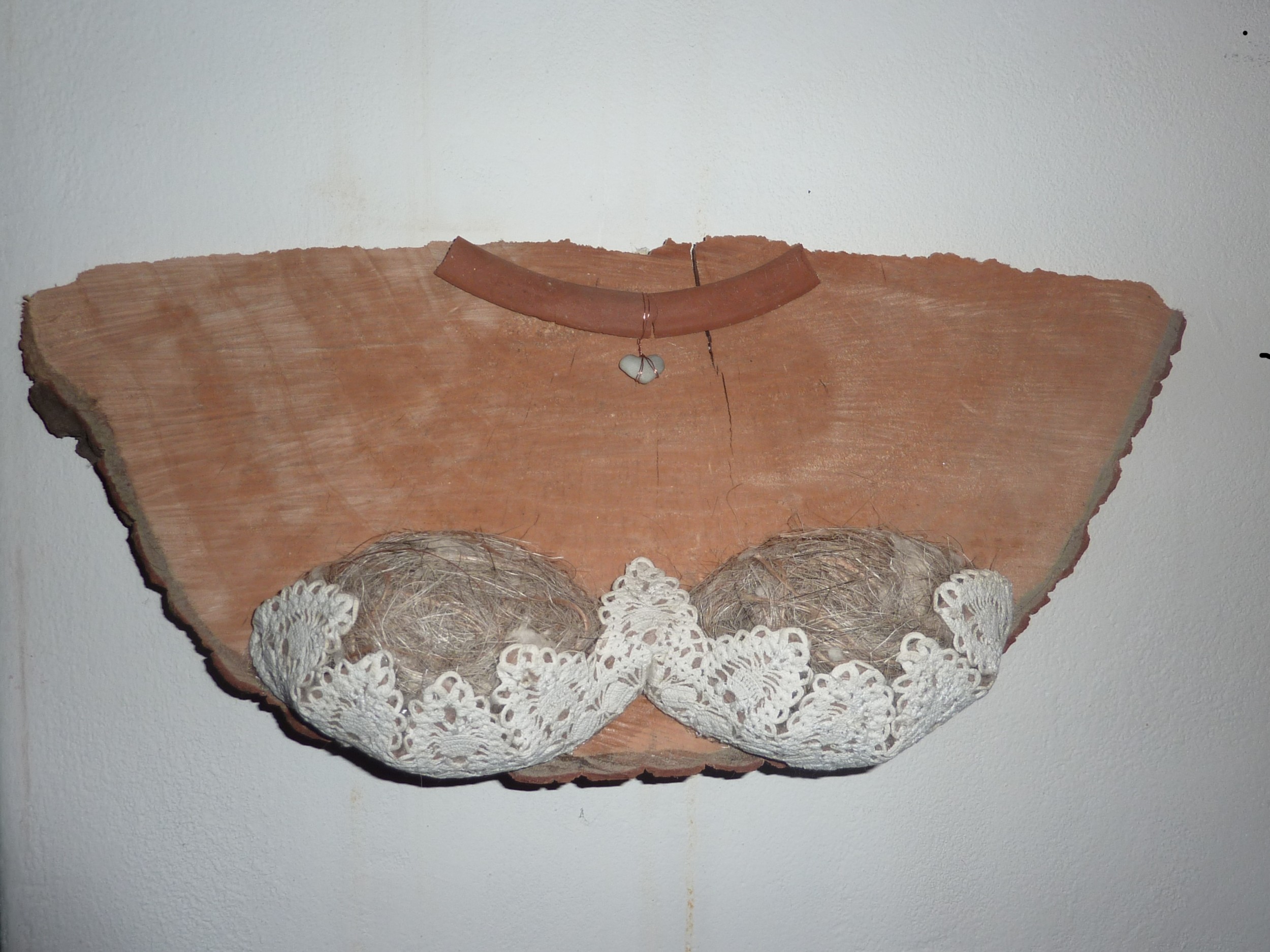 Scultura realizzata solo assemblando materiale naturale e di recupero. Il titolo rimanda in maniera ironica agli interventi di chirurgia plastica sul seno.