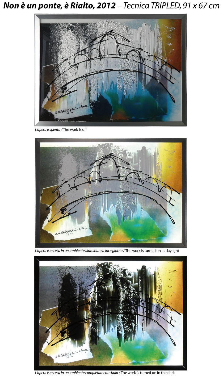 strati di colore che compongono l’opera. Un’opera, tre emozioni: spenta, accesa in ambiente illuminato,