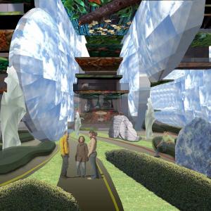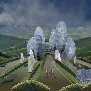 La terra è rappresentata dall’architettura-natura che si esprime in volumi sospesi contenenti le differenti funzioni con la stessa forma e annullato in tal modo il concetto di tipologia distributiva.
