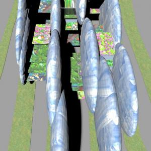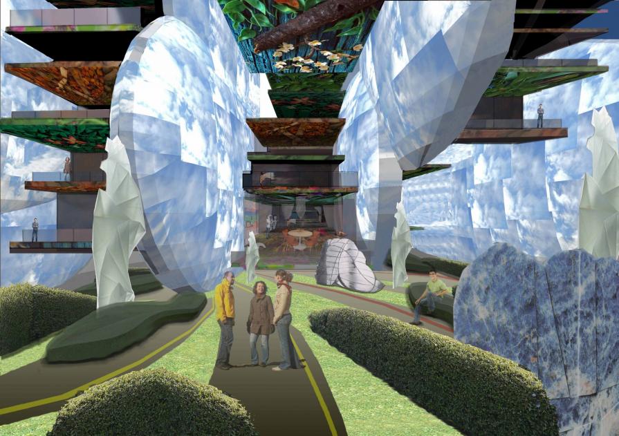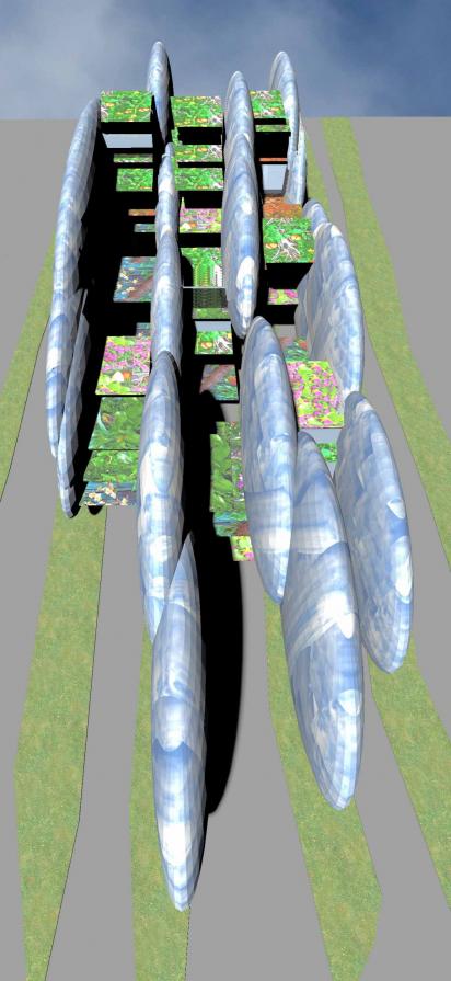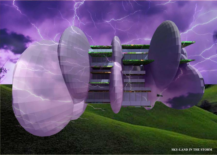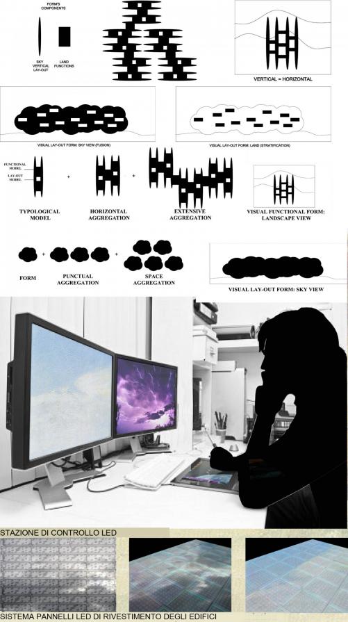 Il cielo è rappresentato da un edificio a forma di nuvola, a guscio; una nuvola realizzata da una struttura reticolare in acciaio duplex, appoggiata al suolo e rivestita esteriormente ed internamente da pannelli di LED che trasformano l’immagine generale in possibili tipologie di cielo: nuvoloso, uggioso, solare, notturno, stellato etc. La scelta dell’immagine del modello del cielo avviene tramite un programma inserito in un computer applicato su ogni nuvola, in modo tale da permettere ai fruitori degli spazi di definire a proprio piacere l’immagine esterna di questa architettura mediatica, fino ad una fusione tra il cielo reale e quello virtuale della nuvola architettonica. Una sorta di “utopia partecipata” per la costruzione dello spazio urbano che agisce attraverso un protocollo di gestione e di controllo della sua mutazione dalle immagini riprodotte sulla superficie esterna/interna delle nuvole.