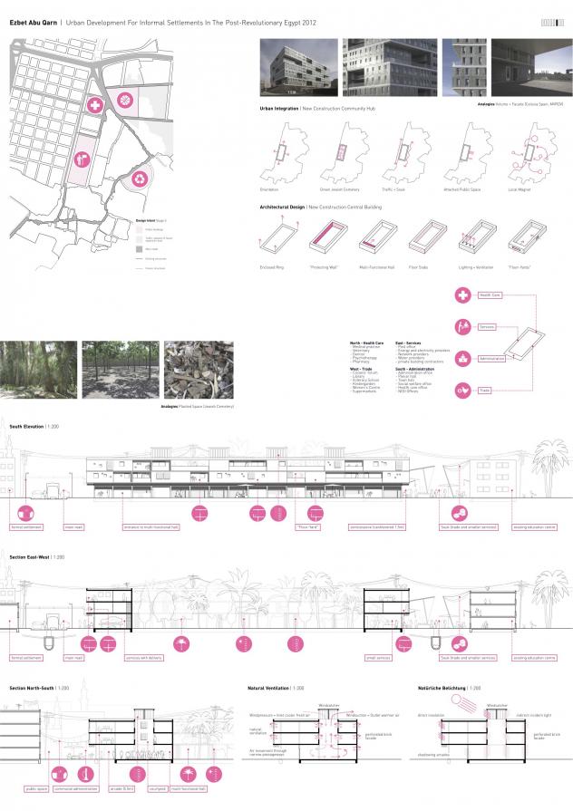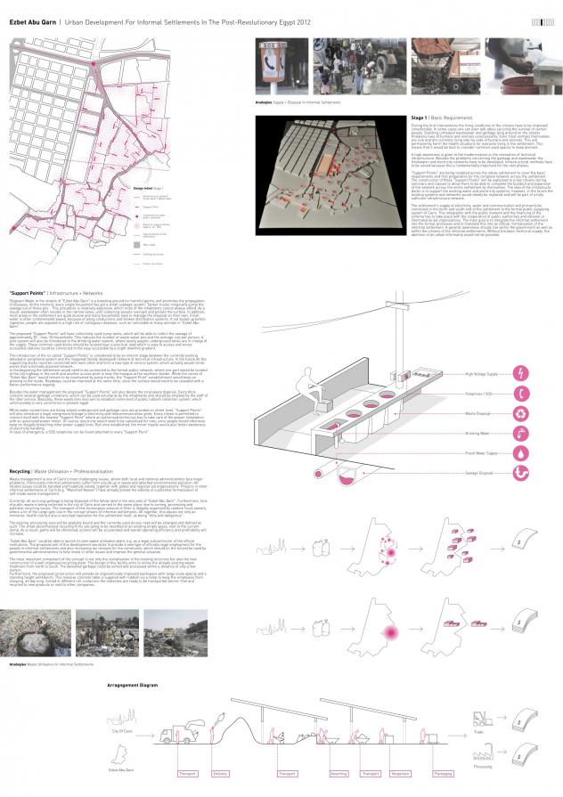 This project‘s aim is to redevelop one of the many settlements and to set an example for the future. The settlement "Ezbet Abu Qarn“ will therefore be improved in terms of its urban planning, its infrastructure and other technical aspects. Moreover, the main aim was to integrate the settlement into the overall urban structure of Cairo. The masterplan is divided into three stages where the citizens are integrated and involved in almost every step. This way the project can slowly develop over the generations through public participation in both the political and design stages.