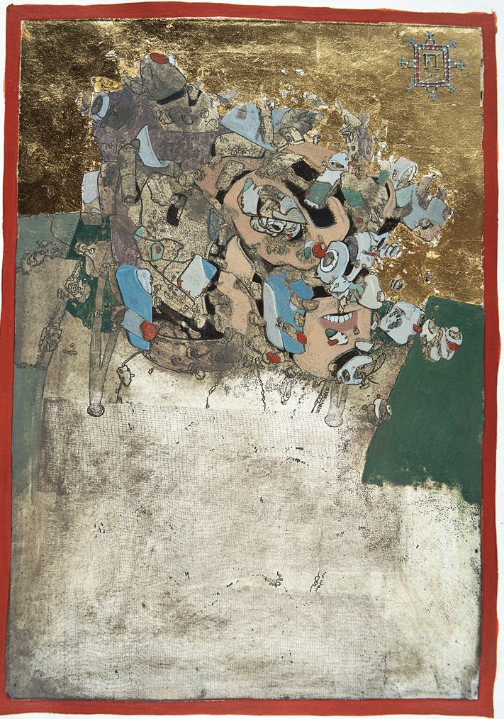 This work is a drypoint plexiglas etching painted over with ink and egg-tempera and overlaid with gold leaf.