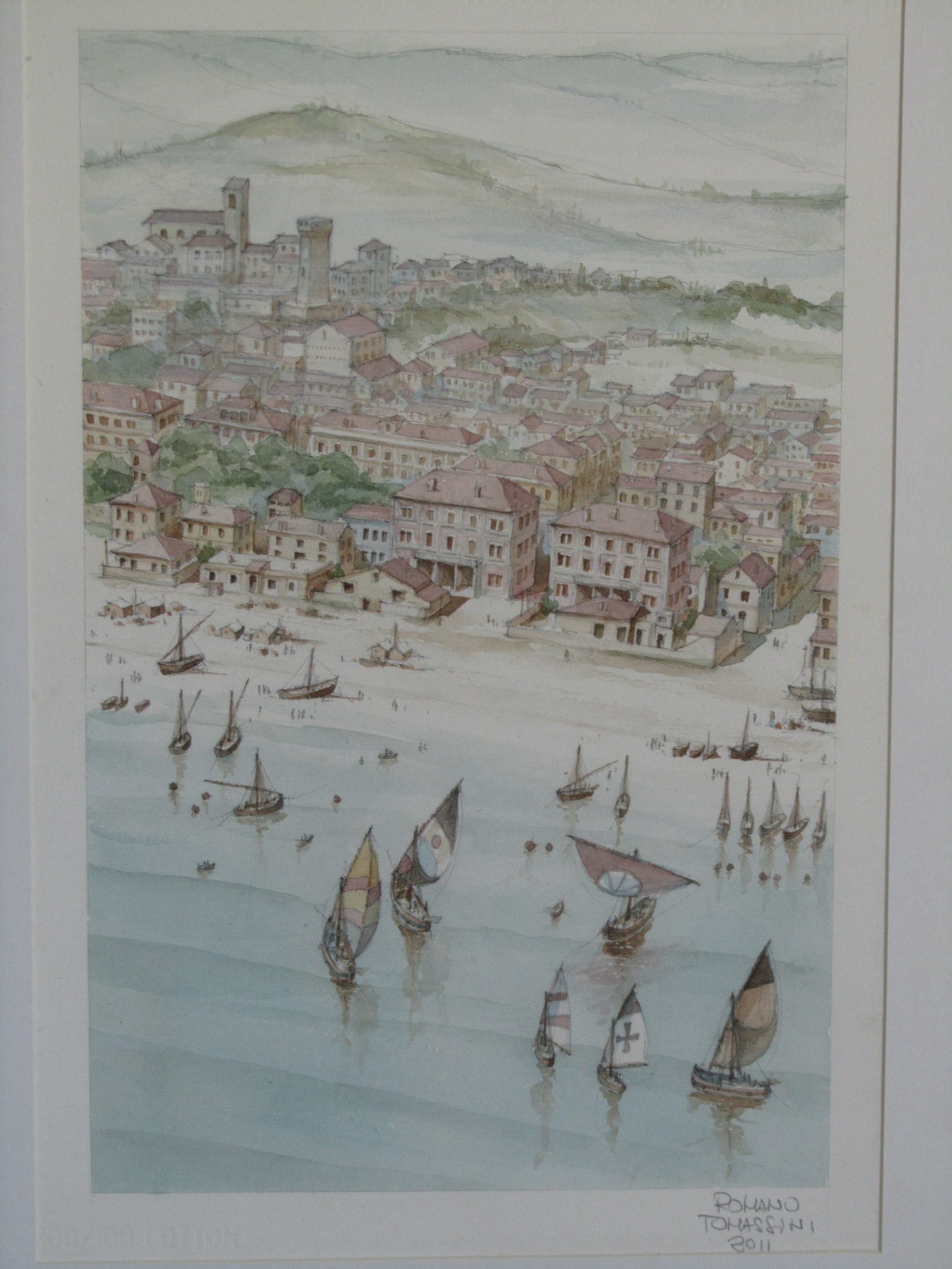 Il quadro è una veduta dall'alto, a volo planare come di gabbiano, sulle coste del mare Adriatico, dove le vele, le case, il paesaggio, le persone, convivono in una coesione intima e naturale