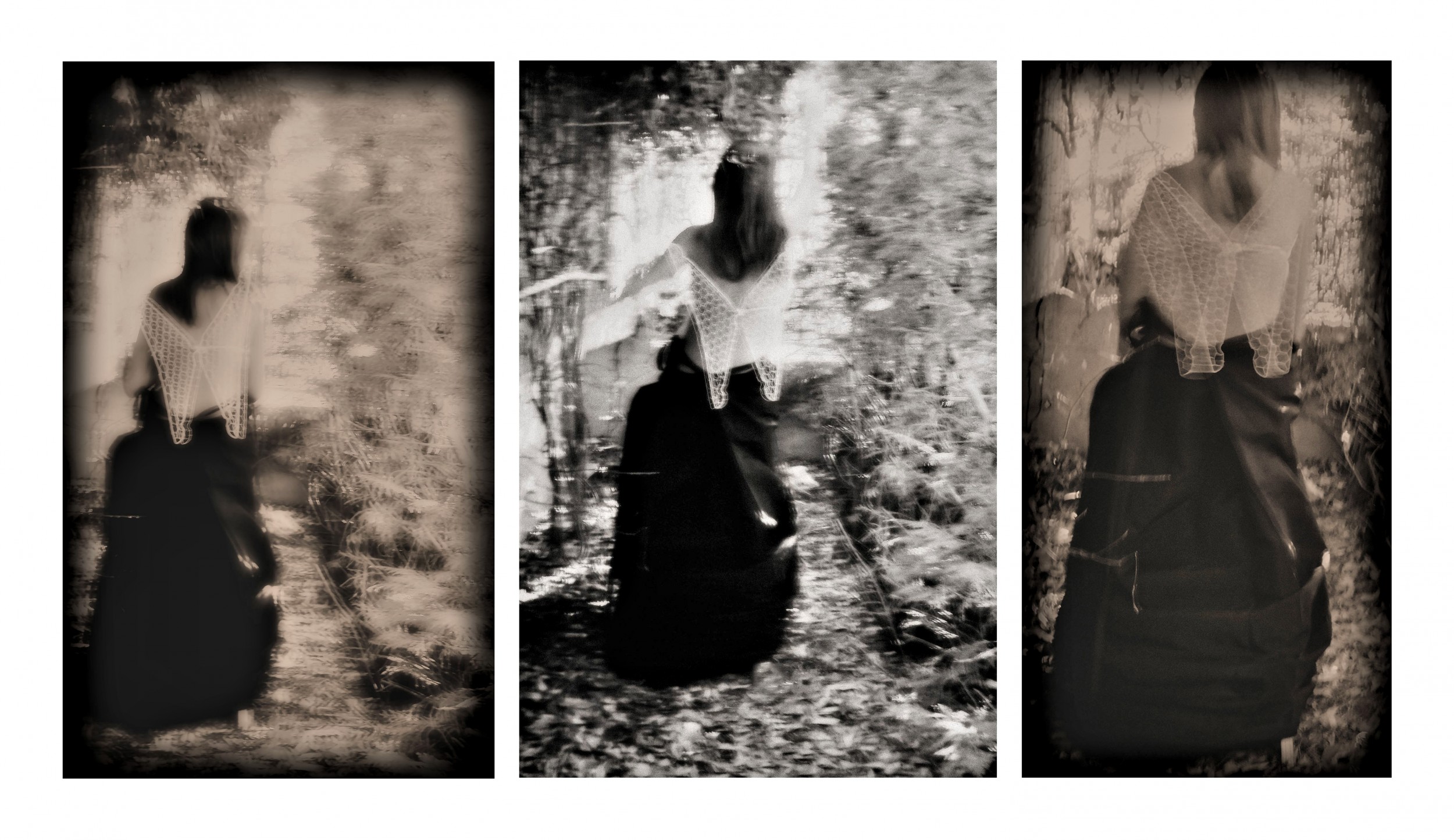 Le figure ritratte nell'immagine sono riprese di spalle immerse nella natura, nello spazio di un giardino, in un'atmosfera di magia -dove la natura è luogo di mistero abitato dagli spiriti.