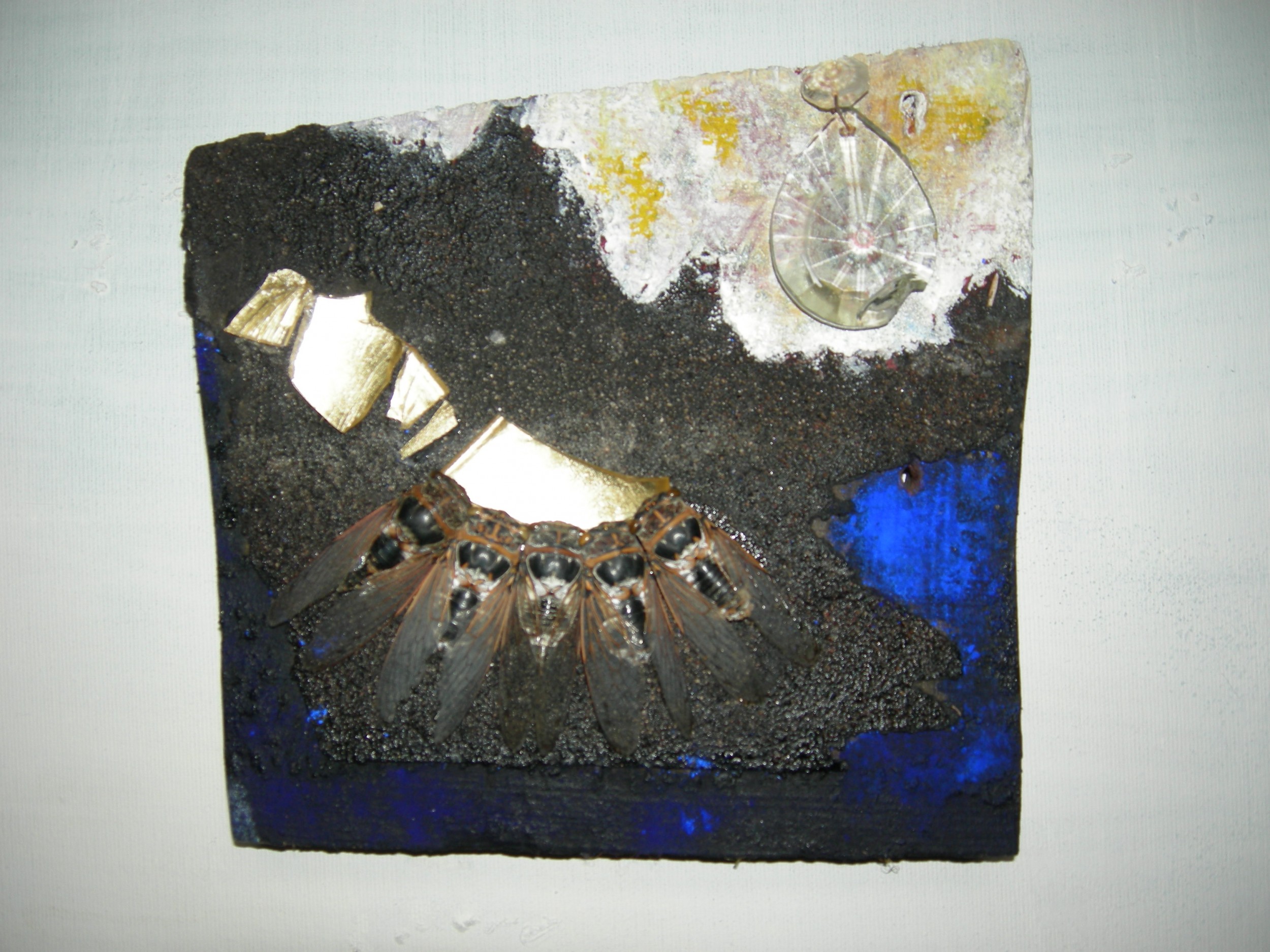 opera che fa parte della serie "L'IMPRONTA DEI TUOI MORSI", è costituita da cinque cicale che bevono luce dorata da frammenti in vetro, sovrastate da una goccia di cristallo.