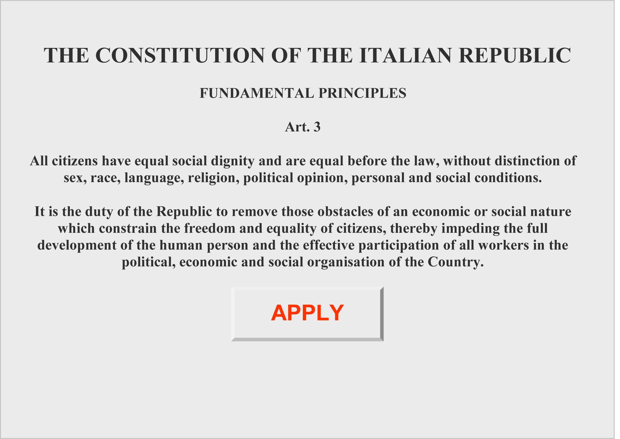 È compito della Repubblica rimuovere gli ostacoli di ordine economico e sociale, che, limitando di fatto la libertà e l'eguaglianza dei cittadini, impediscono il pieno sviluppo della persona umana e l'effettiva partecipazione di tutti i lavoratori all'organizzazione politica, economica e sociale del Paese.
