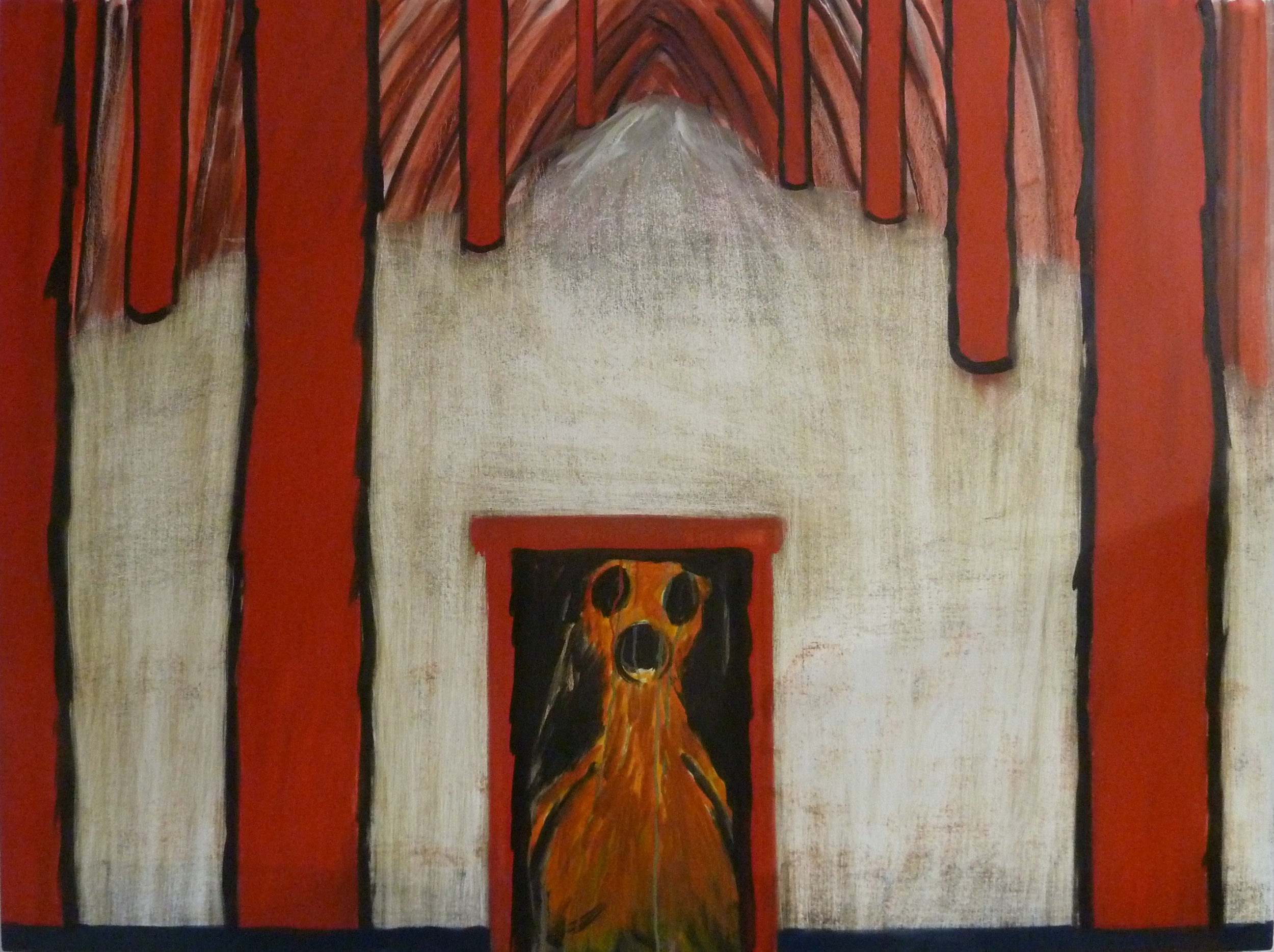 Taken from the quote by Ronald Reagan that a year’s nuclear waste could be stored under a desk, the quote expands into, what if, how certain and how safe is his suggestion. In looking into the story of Chernobyl, I decided to create my own mutated creature inspired by Hollywood creature feature films of the 50s and 60s. The beast is contained in a fragile box like structure constructed out of local dead wood that could at any moment break open and release the creature into the bleak and desolate surroundings. The trees standing around the imprisoned creature have been stripped of life and left bare. Contrasts between past and present, religion and science come to the fore within the work.