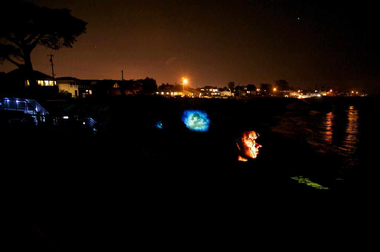 in Santa Cruz, California. Images and text were projected on the cliffside, rocks, and waves