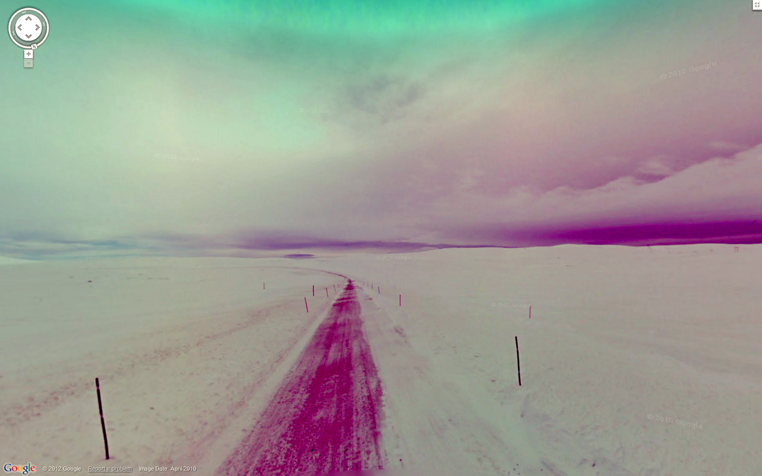 Report a problem è il messaggio che compare in basso nella schermata di Google Street View, e che permette di segnalare all’azienda un problema di qualche tipo nella visualizzazione del luogo che si sta virtualmente visitando. Per realizzare questa raccolta di cento immagini ho viaggiato virtualmente fotografando tutti i “paesaggi sbagliati” che ho incontrato, prima che altri visitatori riportassero il problema inducendo l’azienda ad aggiustare il paesaggio. Paesaggi comuni vengono trasformati da inaspettati errori tecnici di Google in qualcos’altro: appaiono scenari alieni, il caso e l’errore divengono portatori di una sfolgorante bellezza.