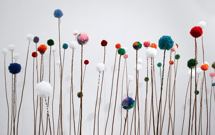 L’installazione si compone di sottili rami di salice, delicatamente piantati dentro a delle piccole basi di gesso, sulla cui sommità fioriscono pompon di lana fatti a mano di diverse dimensioni.