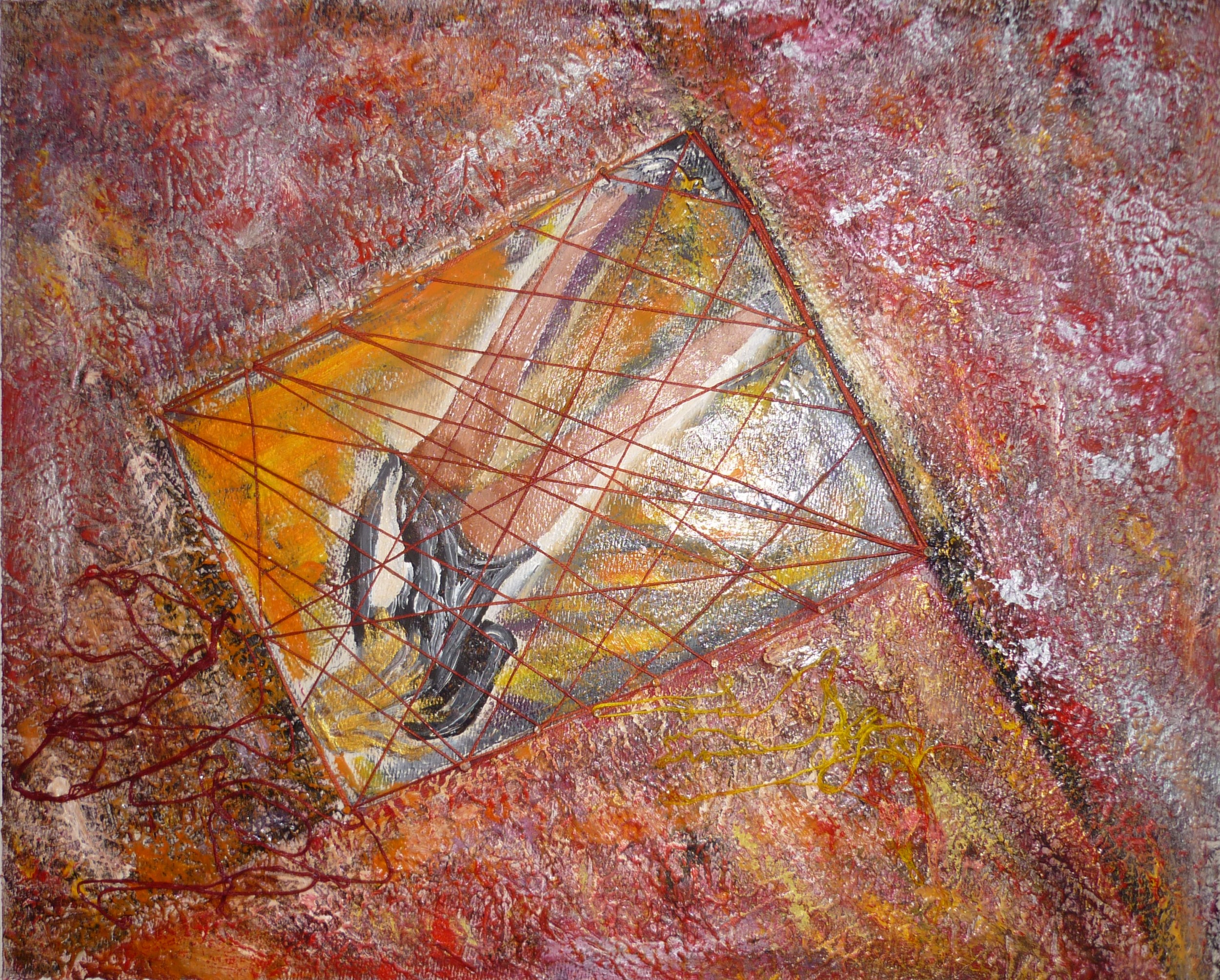 Trovo che sia una composizione davvero interessante:mi piace l'idea del filo rosso che crea una sorta di griglia geometrica( o rete) e la forma dietro quest'ultima è suggestiva ed enigmatica.Complimenti!
