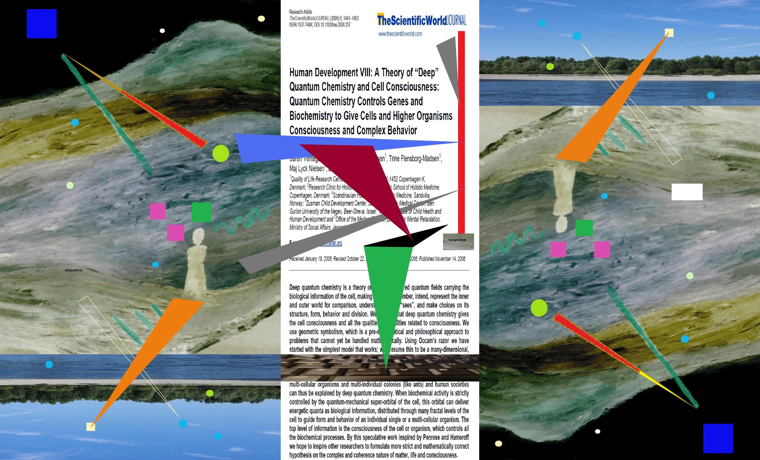 an interesting review from a science network, about quantum chemistry and cell consciousness, added to a computer edited paint about landscape's telephaty, photo of the river Ticino in which i stay, and photo of the keybord with which i press this sign as words that become part of your cognition.