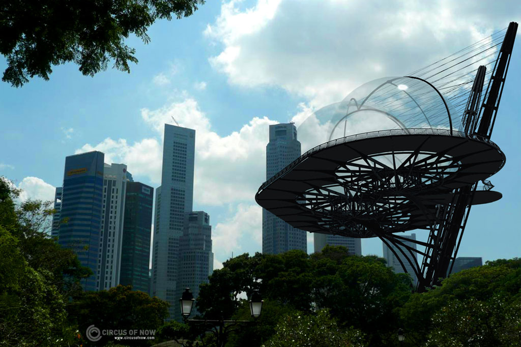 pylons with bedding base, ground tensioning, pylon-to-stage supporting structure, visitor stage with underlying supporting structure, domes/hull with internal supporting structure and visor mechanism, hull tensioning to pylons