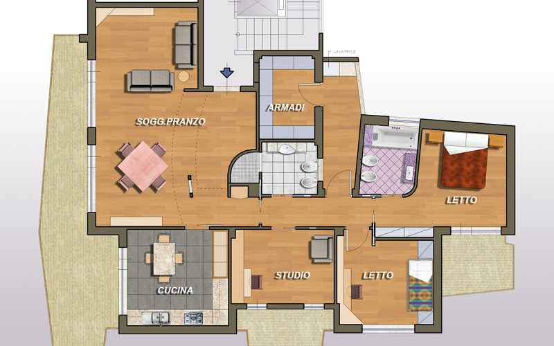 Ristrutturazione completa di un appartamento privato al Portuense (Roma), rappresentazione in pianta della distribuzione dei locali e degli arredi.
