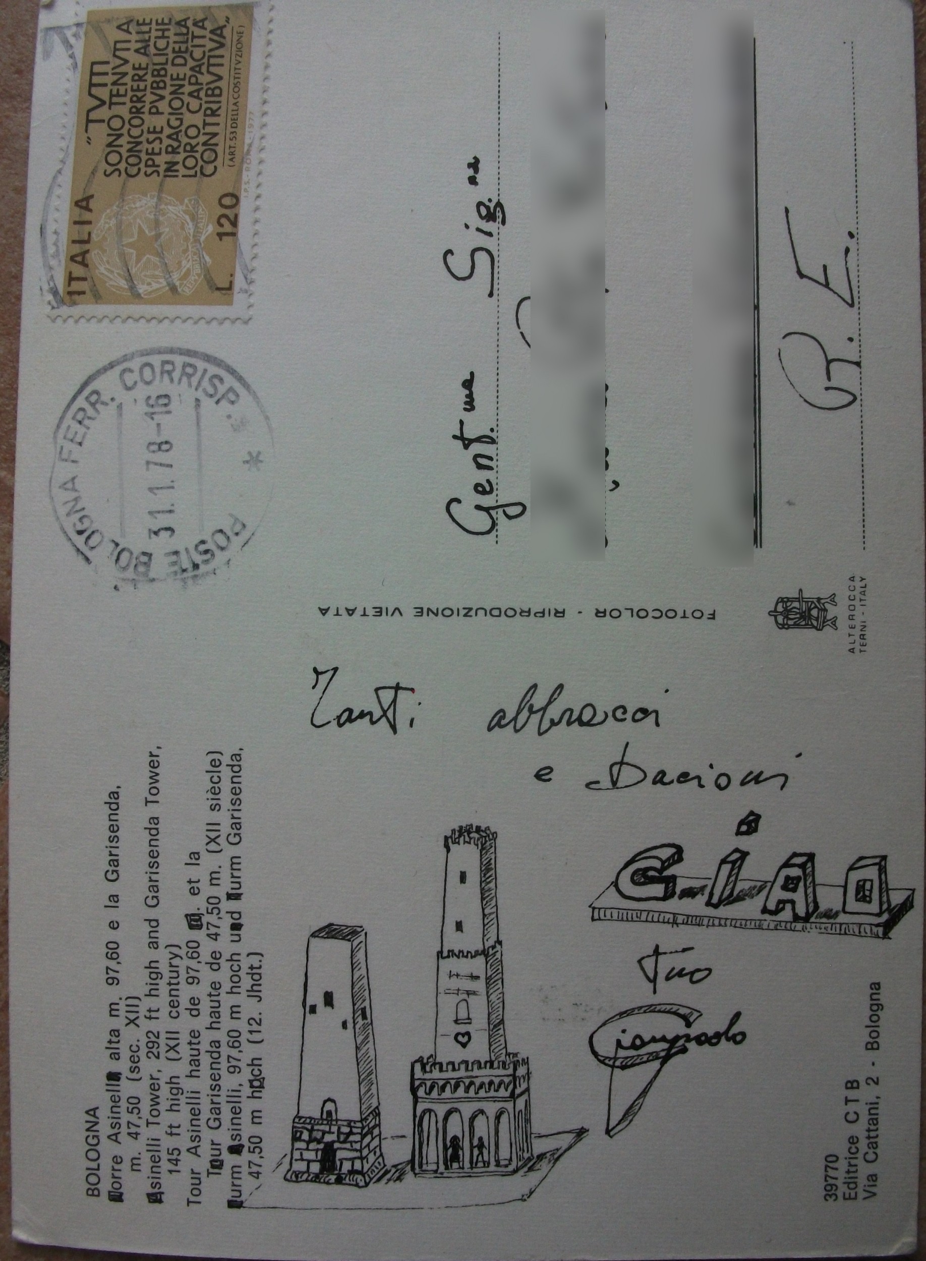 si tratta di disegni a china della città di Bologna realizzati su cartoline e spedite alla mia fidanzata negli anni settanta (la mail-art, cioè arte per posta). Frequentavo allora la facoltà di ingegneria a Bologna e realizzavo queste immagini della città con messaggi romantici nascosti, per non renderli visibili al postino.