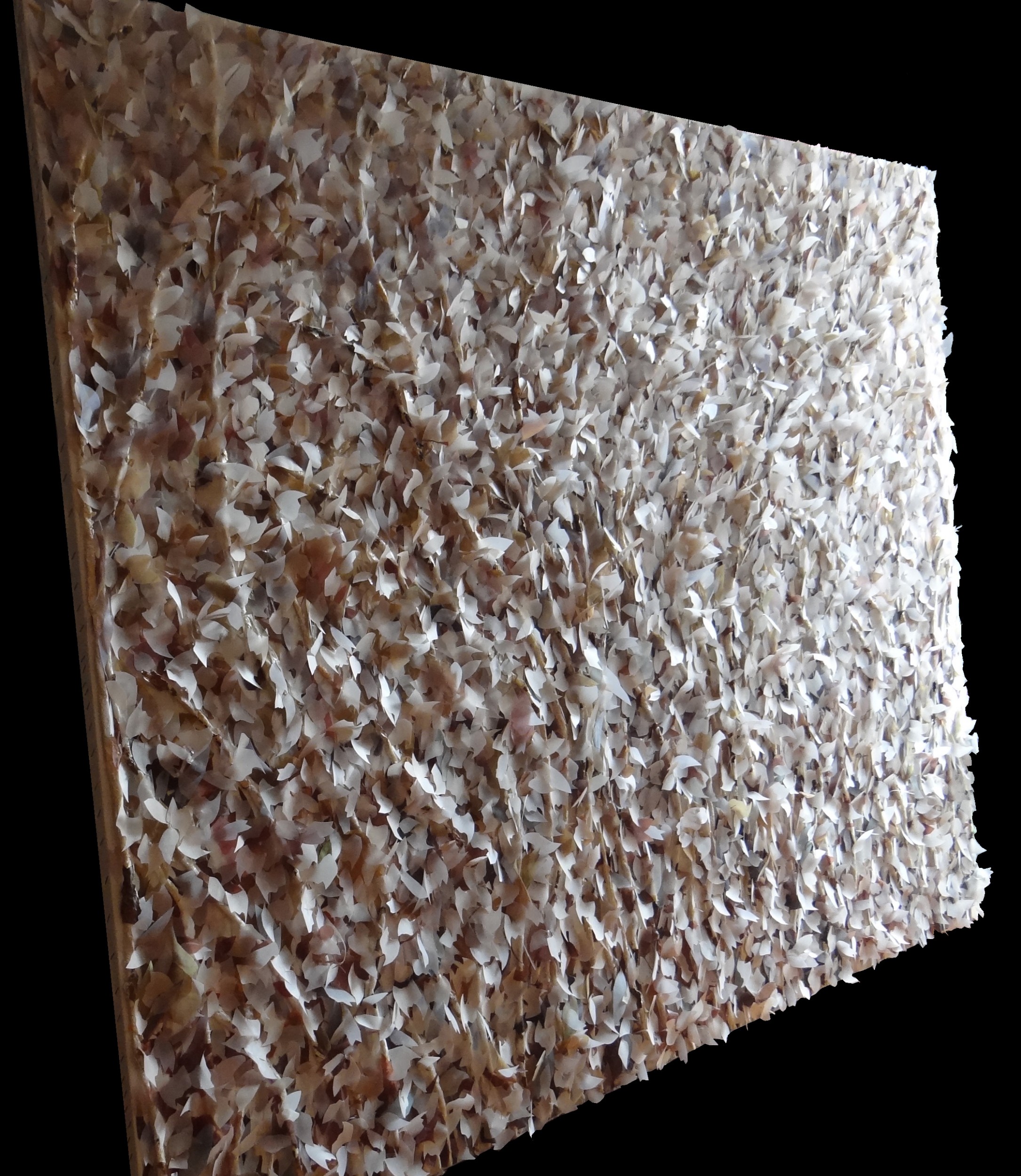 Un lavoro lungo e complesso conseguente ai miei studi diretti sulla natura e sulle sue trasformazioni. Uno studio su forma e luce grazie anche all'ausilio della grafica digitale. I rami coperti e adorni da migliaia di foglie opalescenti sprigionano sfumature di colore regolate dalle ore della luce.
