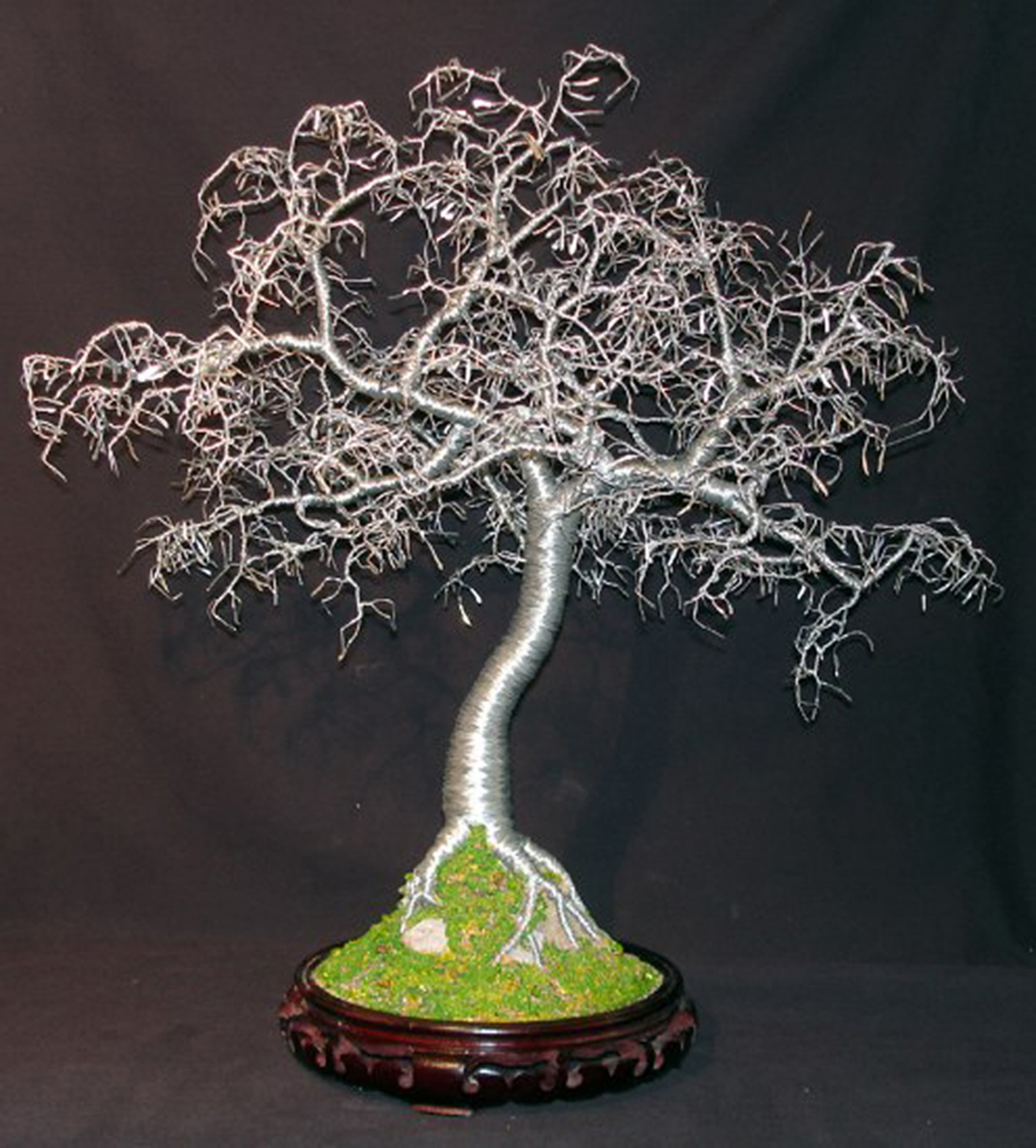 20"H x 14"W x 13"D Created using 24 & 26 gauge galvanized steel wire. The end of each twig is hammered flat to create a flat leaf which gives the tree a very full appearance​. The tree sits on a mound made of sea sand many assorted pebbles and rocks. The sea sand and pebbles are painted in yellows and greens using India ink, which will not fade and gives the appearance of moss covered earth. The piece is planted on a 6.5 inch round antique solid wood base, with hand cut openings on the sides. It was made in Japan.