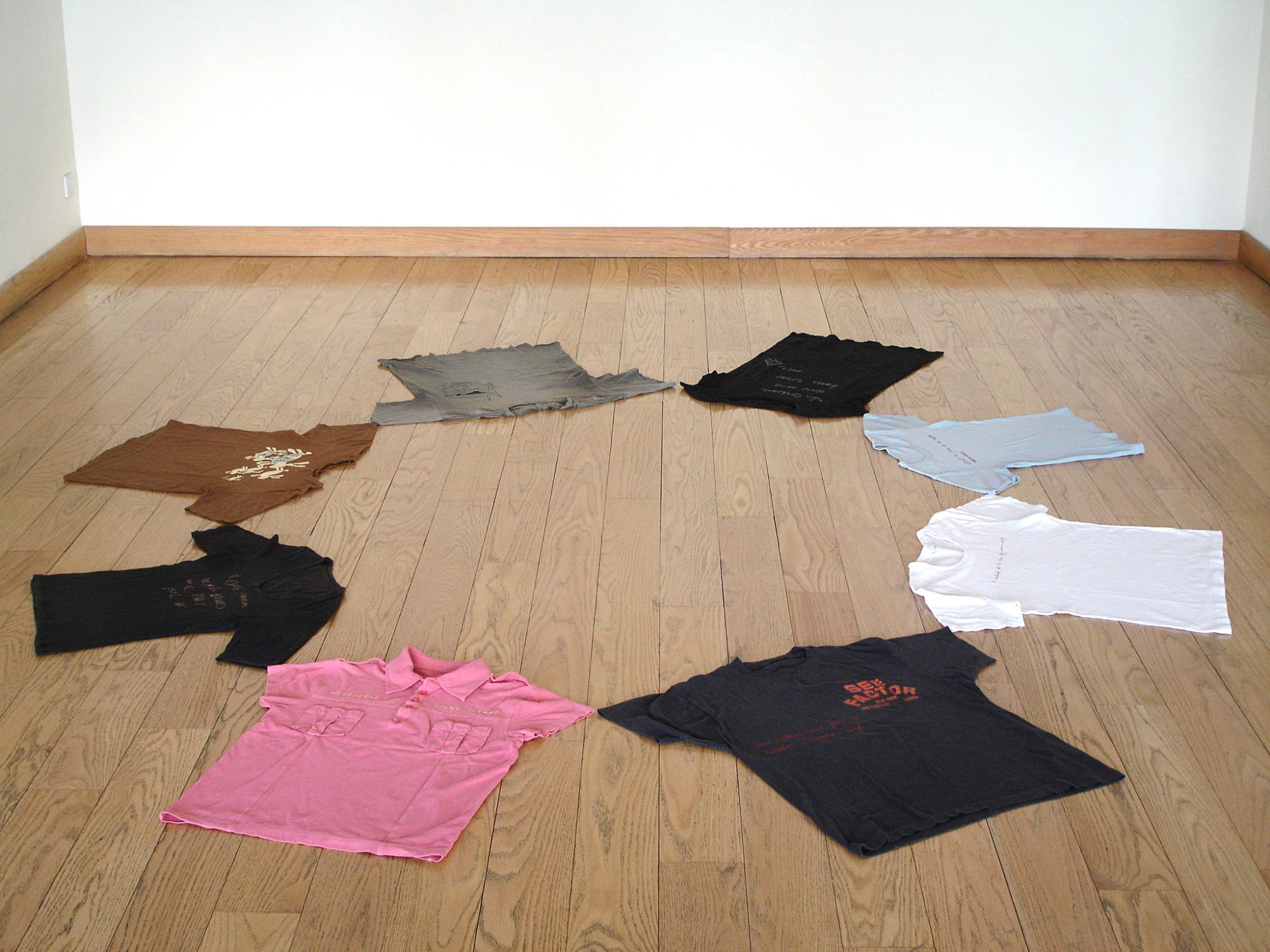 This is a collaborative floorpiece where friends from around the world were asked to contribute an old t-shirt and a phrase (or whatever they wanted to say) written in their own language. Then their text has been embroidered onto their t-shirts in their handwriting, and they have been brought together as a global circle of stories, some funny, some sad or poetic, to comment on how we all carry our stories, dreams, wishes, memories side by side. It doesn't matter what language we speak, we are all united in our humanity, and at this time in history we need to come together in order to advance society as a whole.