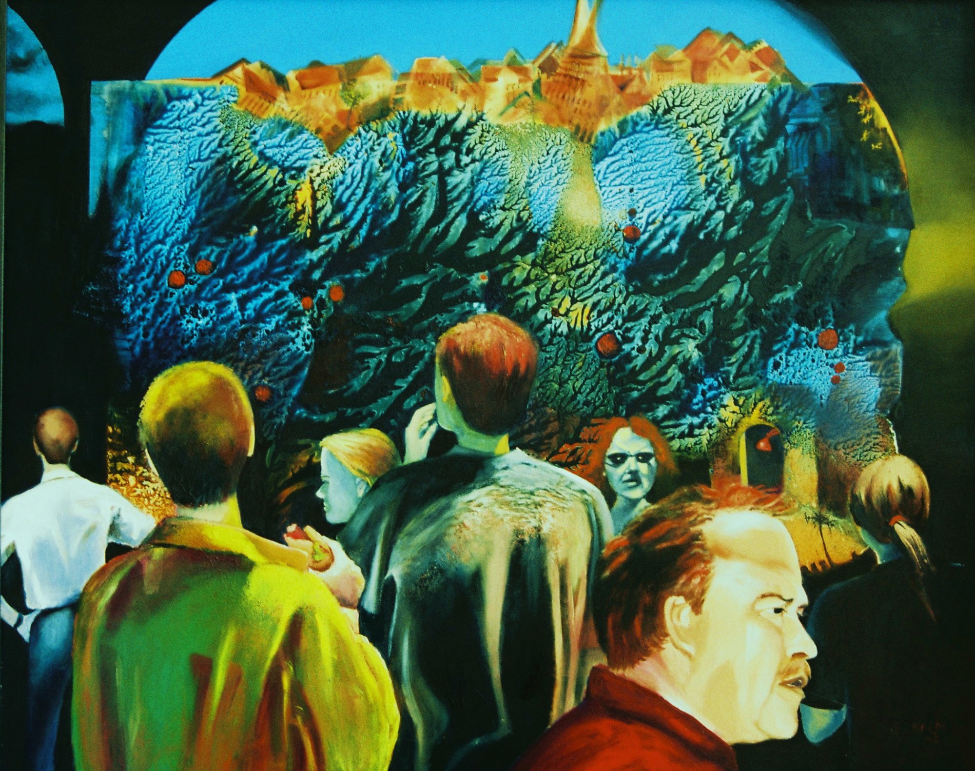 This work shows the result of the menkind who has destroyed their own world through their limitless greed for materialism. God plays no role anymore. You are looking in a dramatic scene.The people who are standing here, take this fact not true. They seem a little insecure - just one man in the middle seems to suspect the danger. Most of the people are watching the spectacle. One of them enjoys his sandwich while slowly goes down his biosphere.So the artist feels the typical Western consumer society, where an engenious technique can even conjure a doomsday in toxic colours.